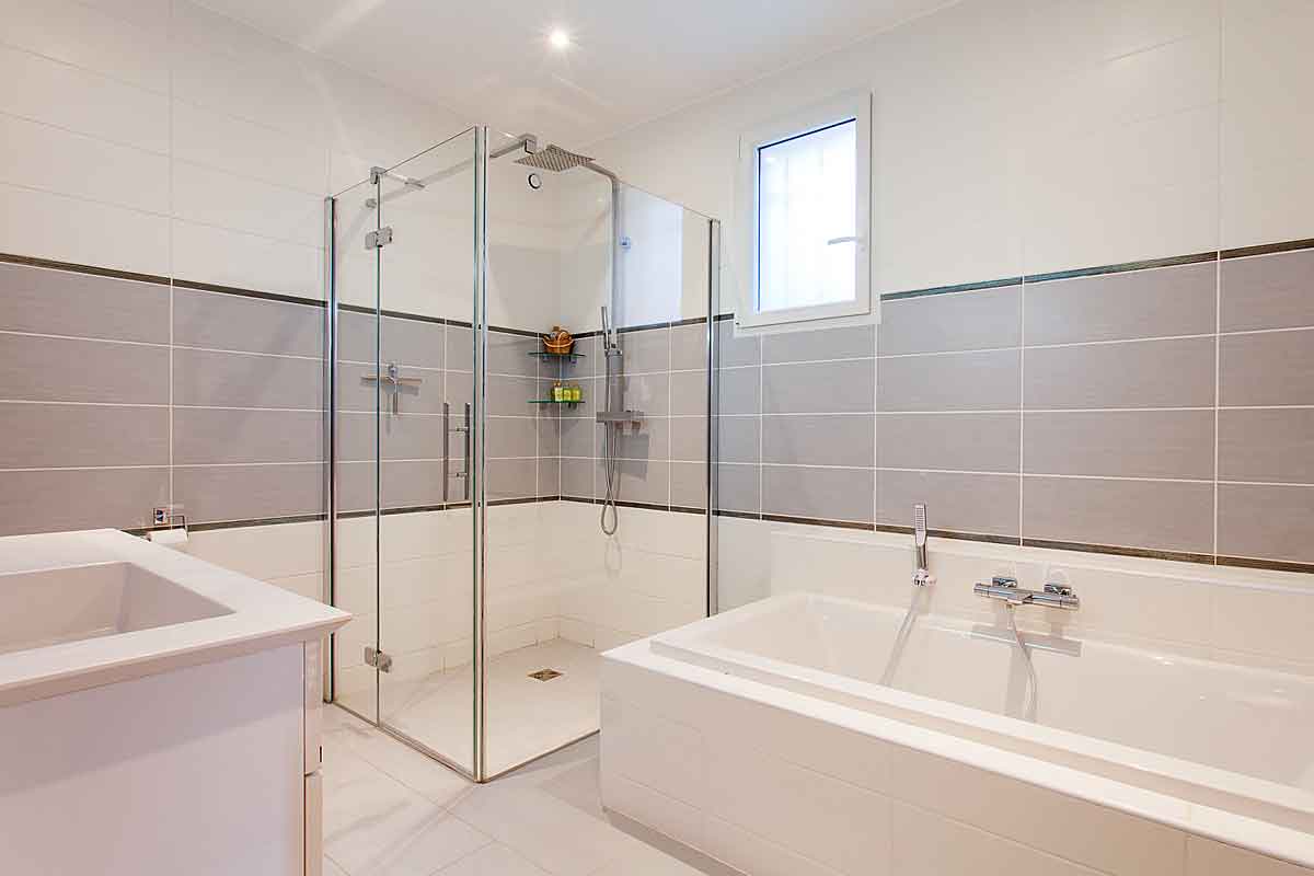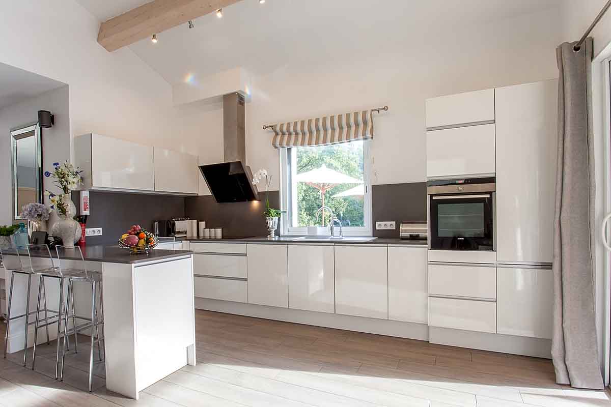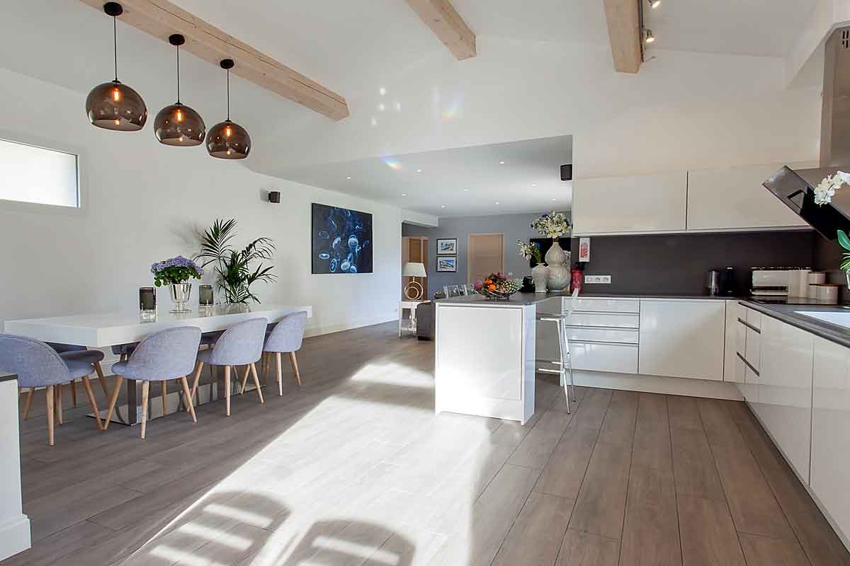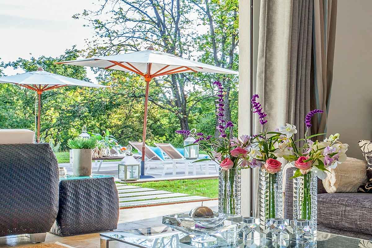 This French holiday rental has been tastefully built in Provencal style. Designed by an interior designer throughout with a lovely light spacious and luxurious feel. The living space is open plan, extremely spacious with large sliding doors onto the lawned gardens and pool area. Lovely views across woodland means this side is not overlooked.