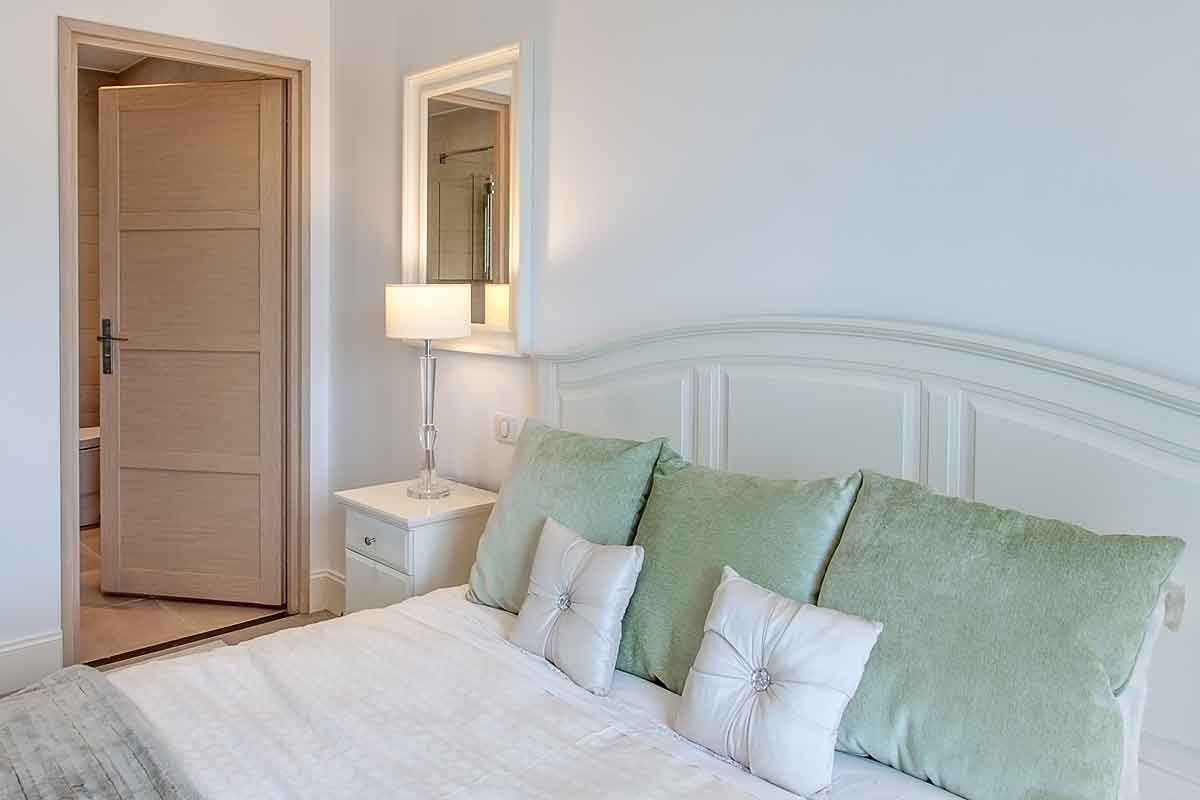 Master Bedroom (Bedroom 1) - king sized bed, wardrobe, furniture and double doors leading onto a private balcony with lounge furniture and railings (ornate railings are being fitted on the low wall on the terrace end of May). Stone steps lead to the lawns and pool. Lovely aspect with views over the pool, gardens and woodland. Air-conditioning.