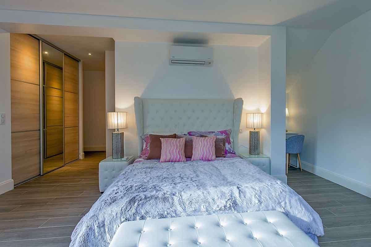 Bedroom 4 - double bed, wardrobe and two windows with views over the grounds and pool. Air-conditioning.