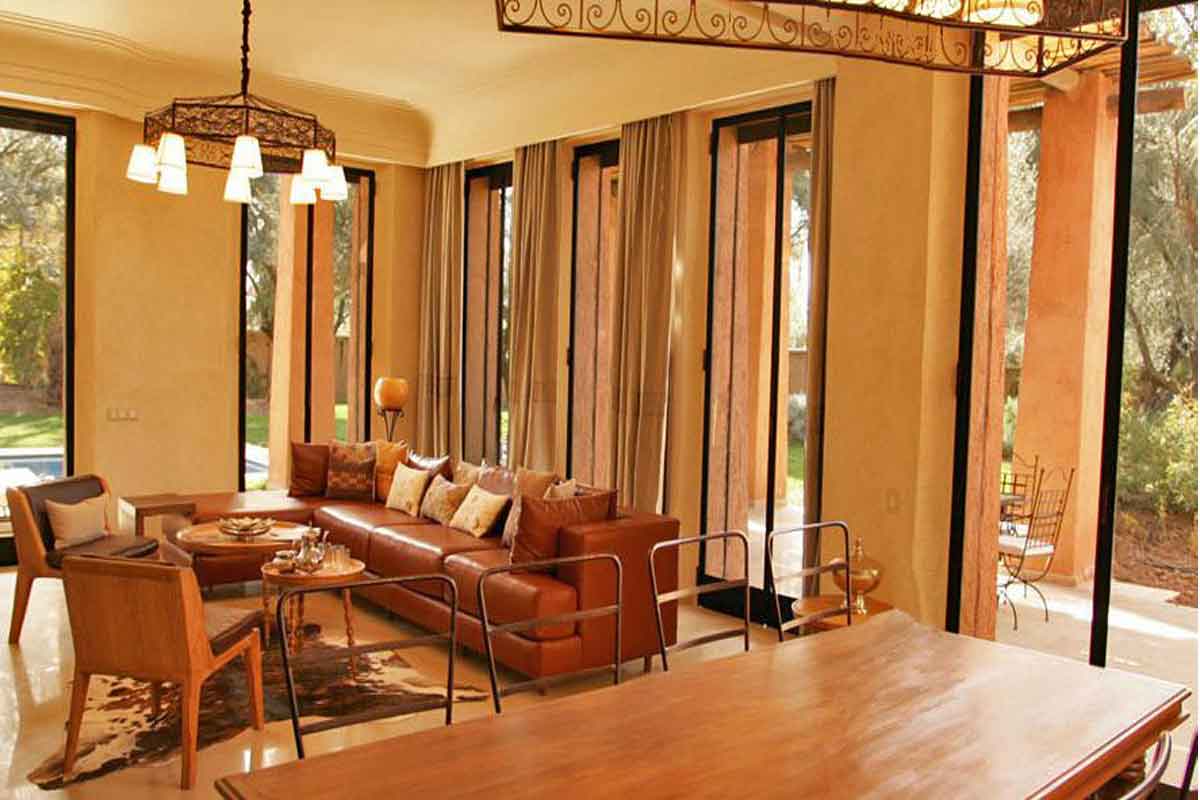A recently built villa that has combined traditional and modern Moroccan elements, offering spacious living/dining areas with huge floor to ceiling windows with views to the garden and pool.