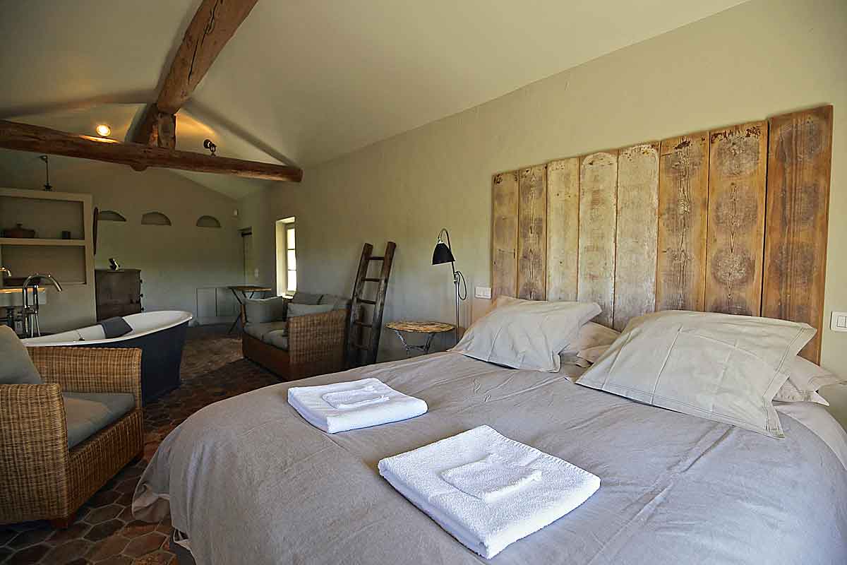 Bedroom 4 - Large rectangle double room, sofa, modern open plan bath and basin, discreet wc. (accessed via stairs from the courtyard).