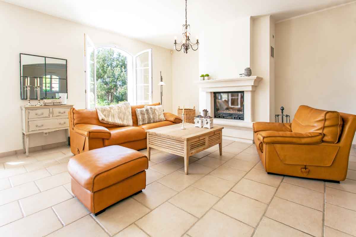 The main lounge has comfy sofas and a wood burning style fire. This room is exceptionally bright and airy with French doors leading onto the terrace overlooking the pool.