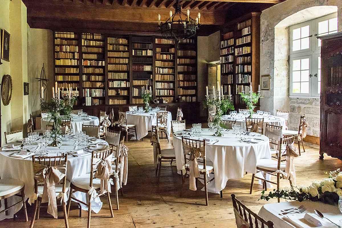 The Knights' Hall - an 86m2 with a dominating floor to ceiling 16th century fire place and bookcases all around. This magnificent hall can seat up to 130 people (not available for use outside weddings/events).