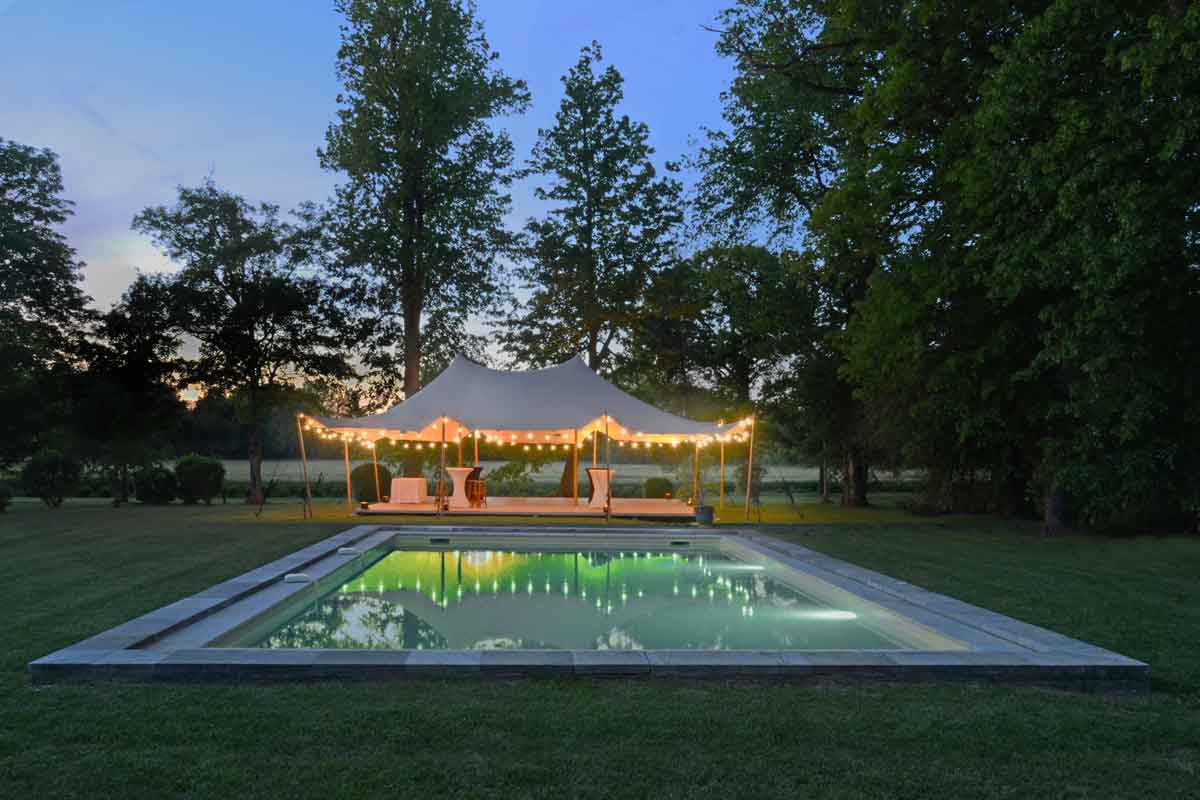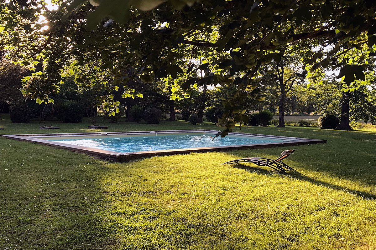 To the side of the Chateau, the swimming pool, 10m x 6m and 1.6m deep, sits on the manicured lawns which spill over into the fields beyond. There is a little stream that runs through the grounds.