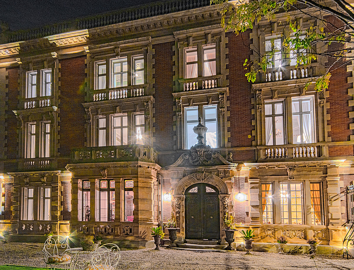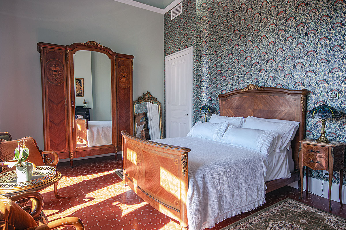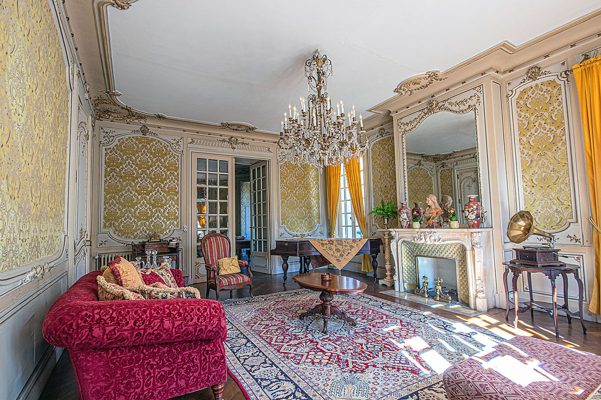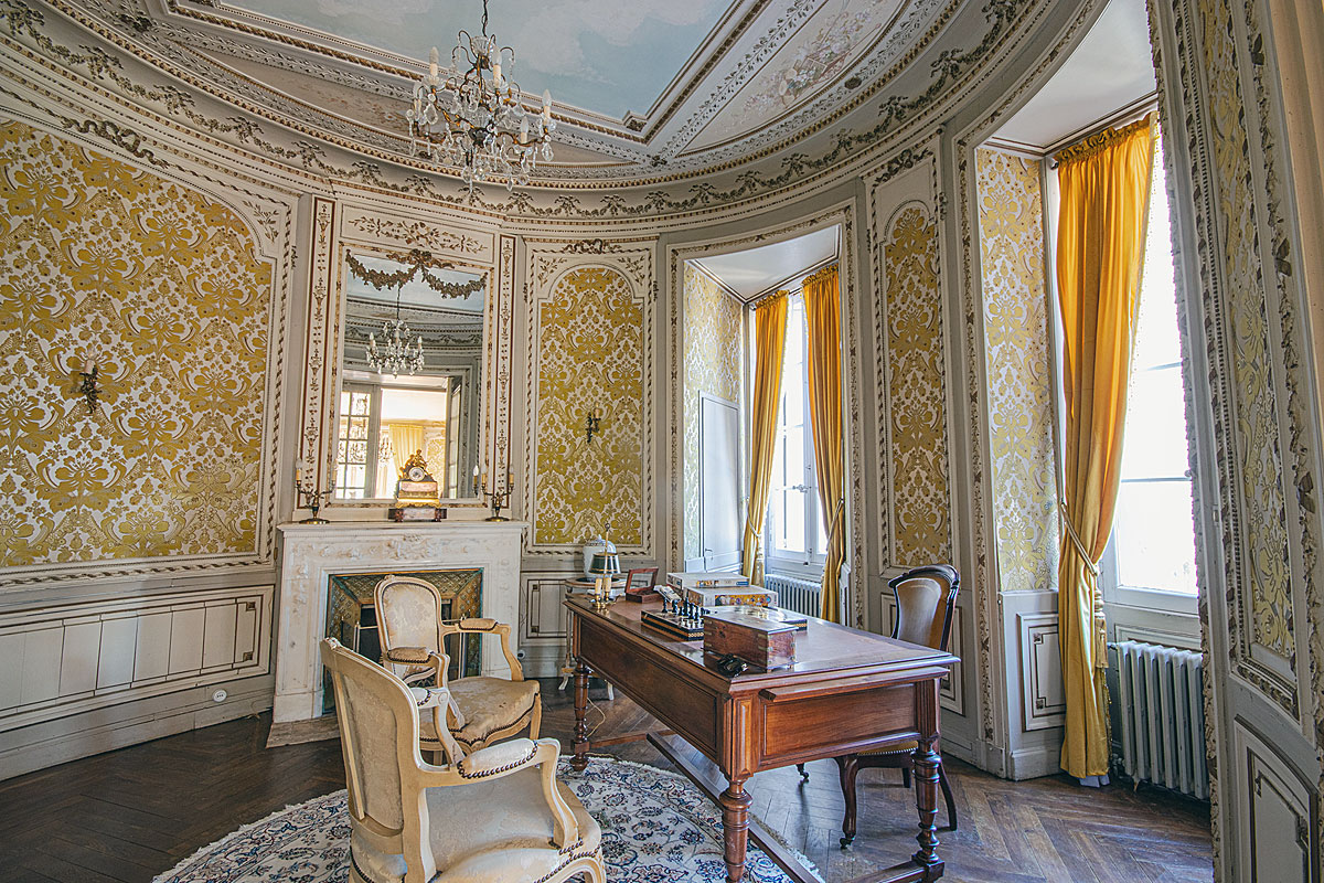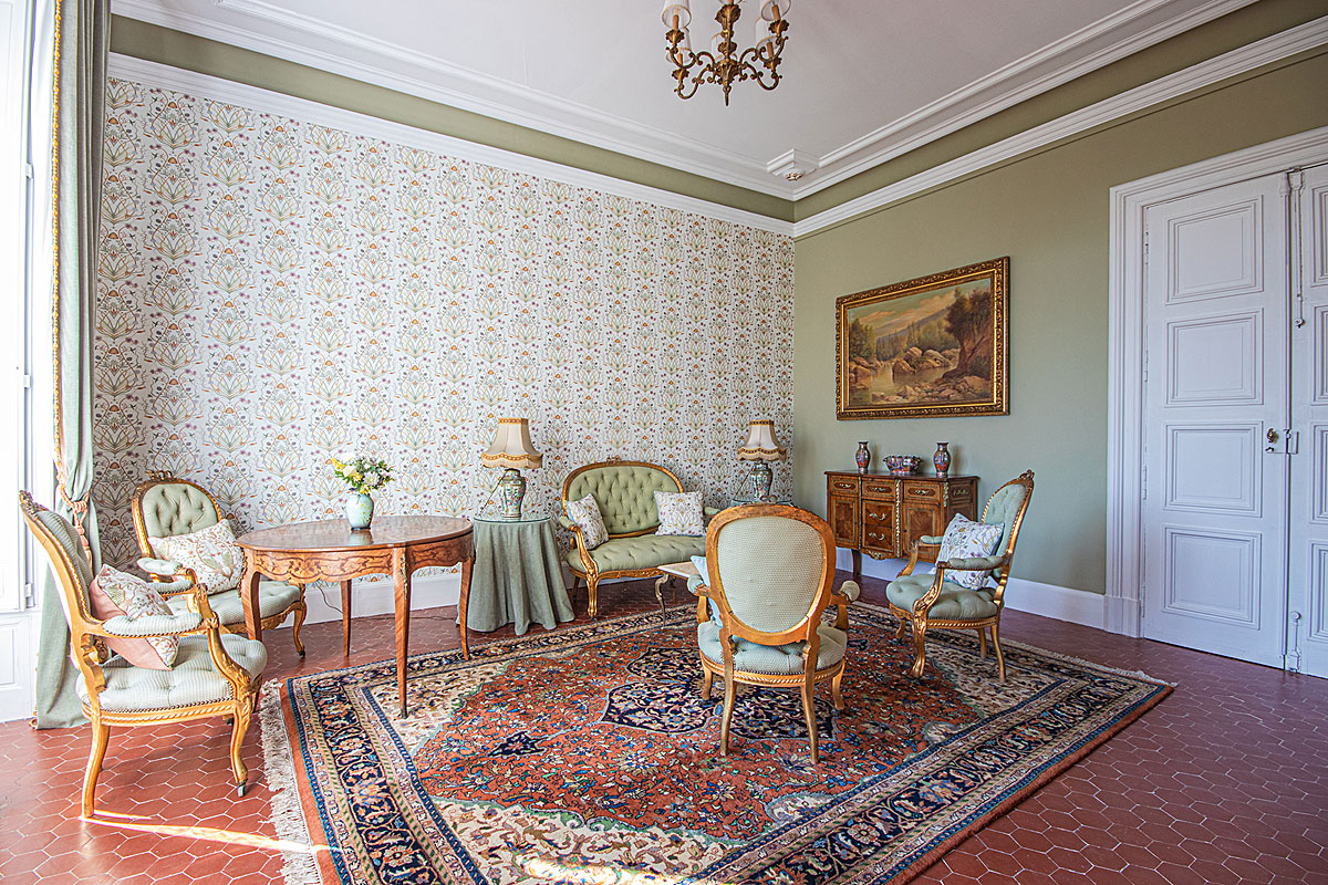 French doors lead out onto a small balcony with a table and chairs, the whole suite overlooks the Chateau’s front garden and fountain. The sitting room also has doors that lead onto the hallway.