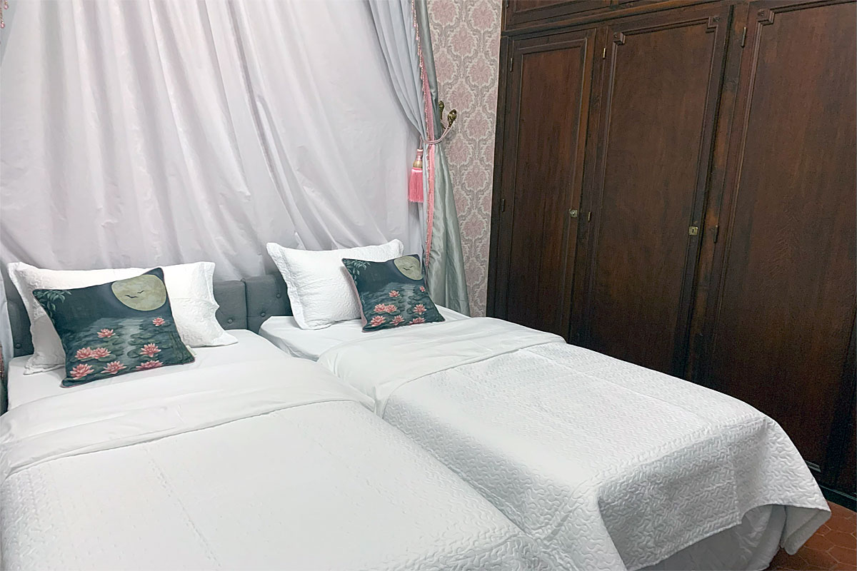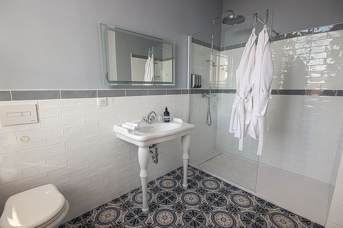 An independent wc is off the hallway. At the other end of the hallway through double doors is a twin bedroom, this is the only bedroom without air-conditioning however there is a fan. This room can either share one of the other bathrooms on this floor or use the independent shower room on the 2nd floor.
