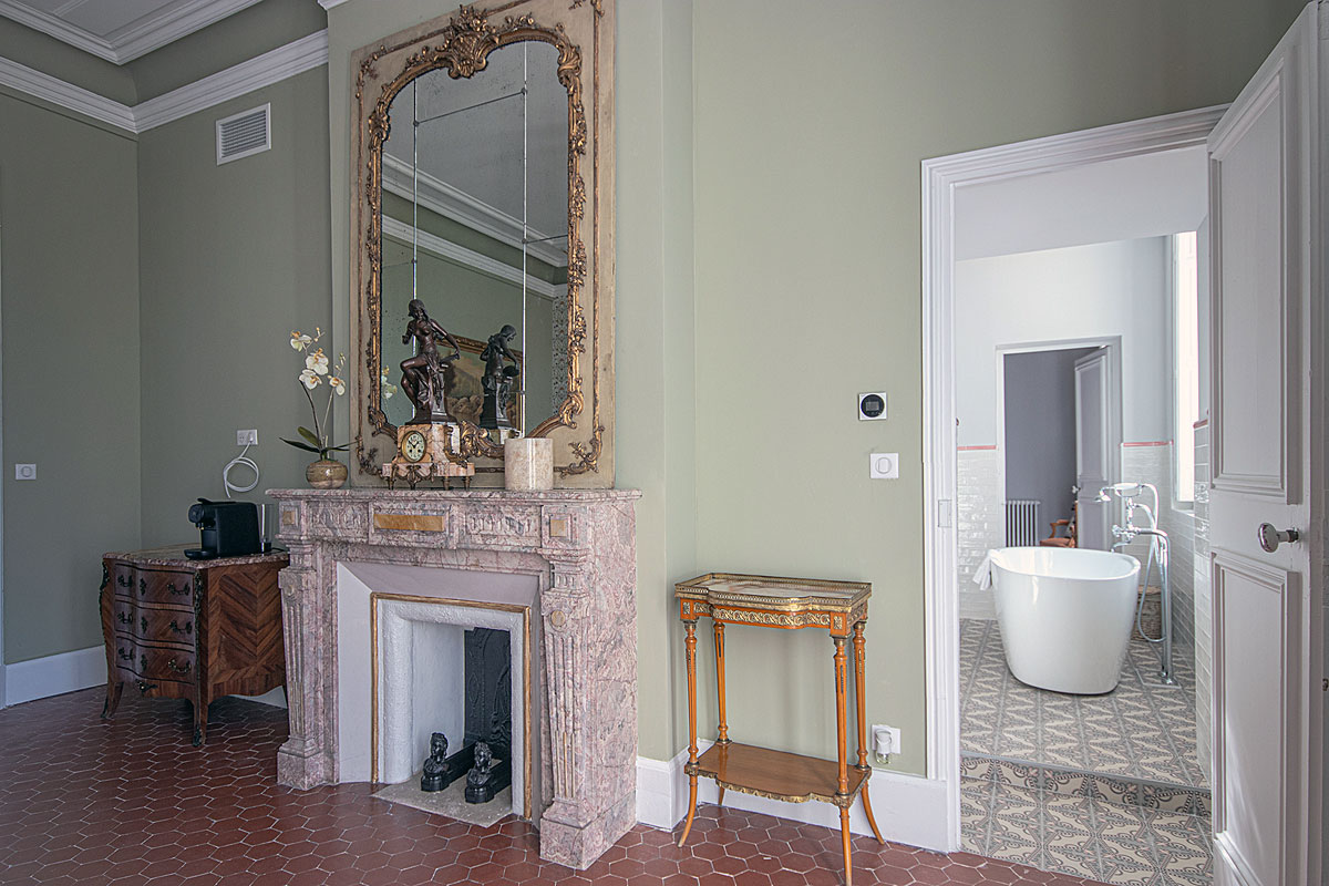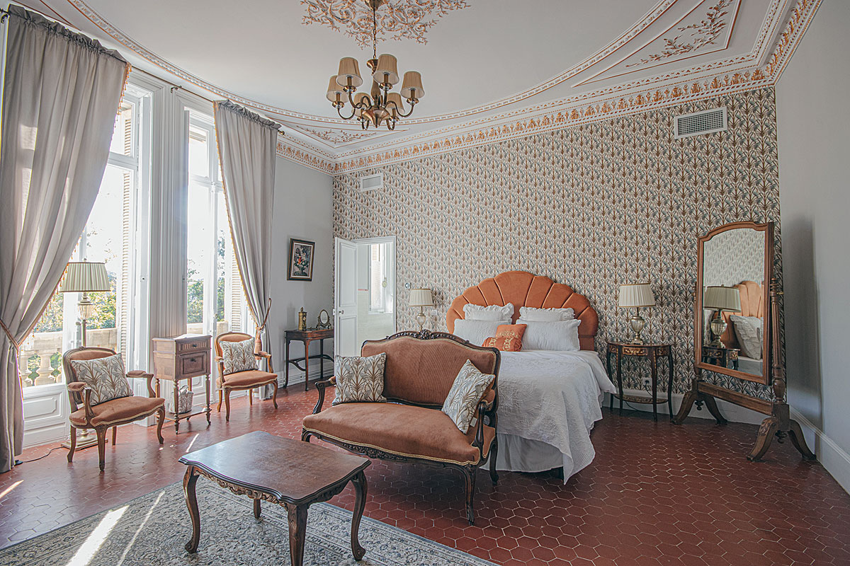 The Vermilion suite, air conditioned, super-king size bed (180cm), original features including a pink marble fireplace, large modern ensuite with rain shower, free standing bath and wc. From the bathroom, doors lead into an air-conditioned sitting room, perfect should you need to work whilst on vacation, or just take time out with a coffee using the machine in the room.