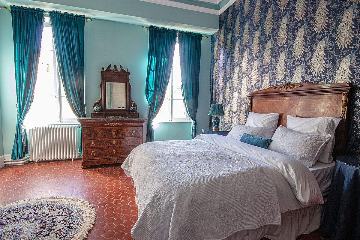 The first of the four bedrooms on this floor is the Peacock bedroom, air-conditioned, bright and airy with 2 shuttered windows overlooking the village square, double bed (160cm), large, modern en suite shower room, with a rain shower, sinks and wc.