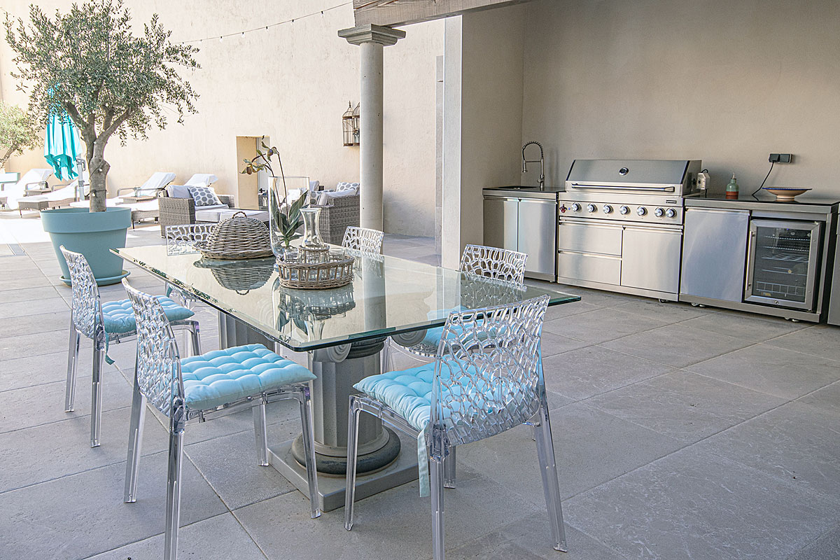 A large gas BBQ and Pizza oven are by the pool in the fabulous stainless steel outdoor kitchen, there is also a drinks fridge.