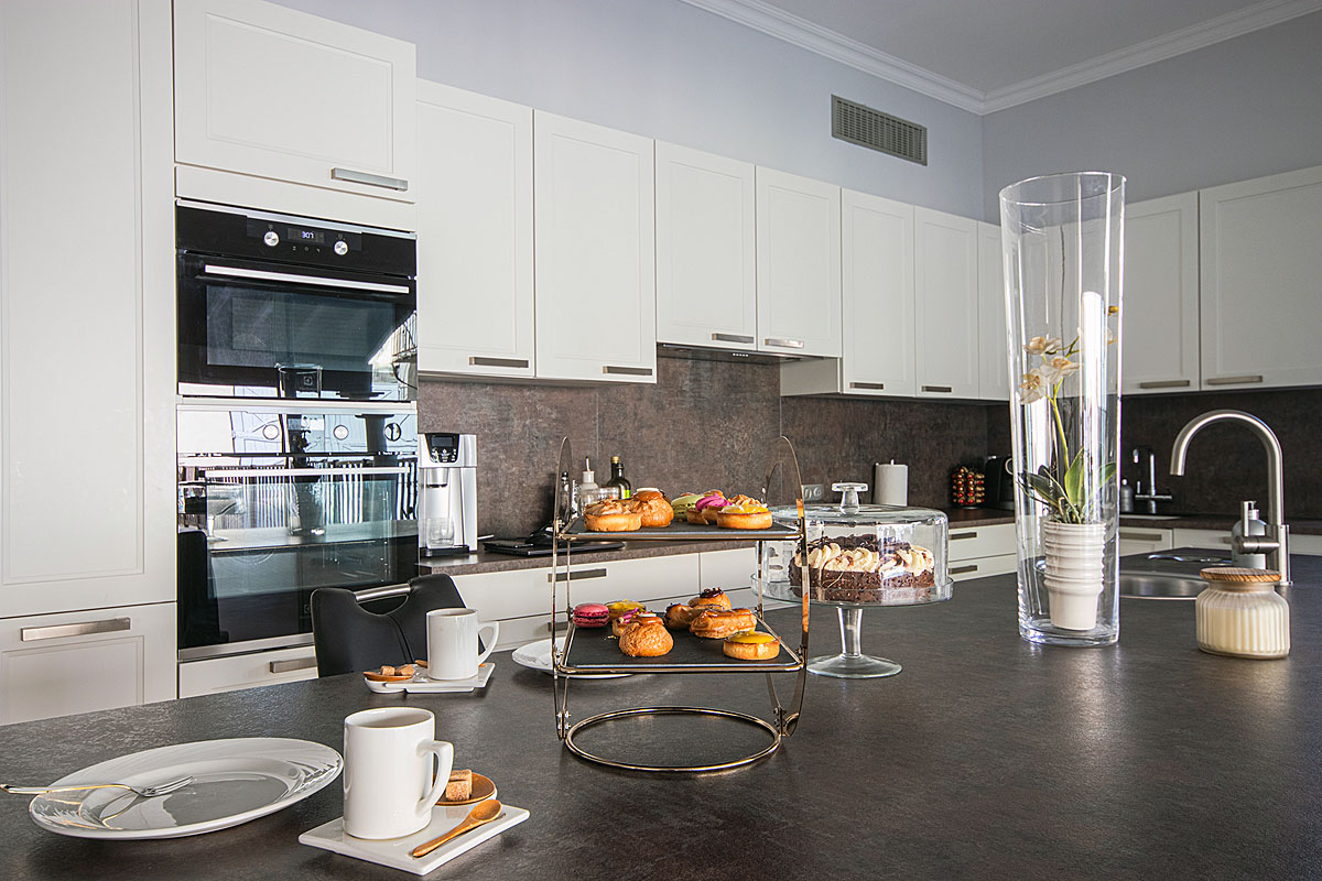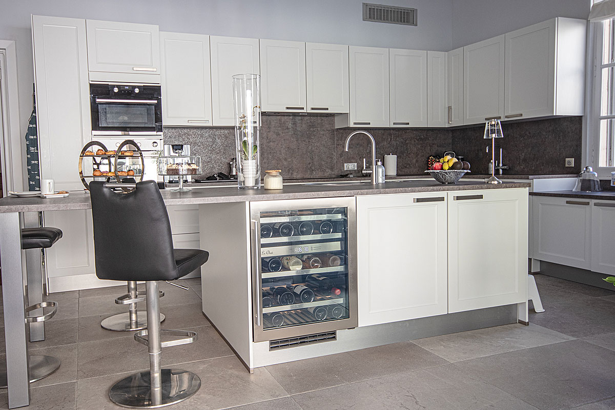 Swing doors lead into the large, modern kitchen which is equipped with everything that you could possibly need. An island with stools houses the special wine fridge which can be stocked for your arrival.