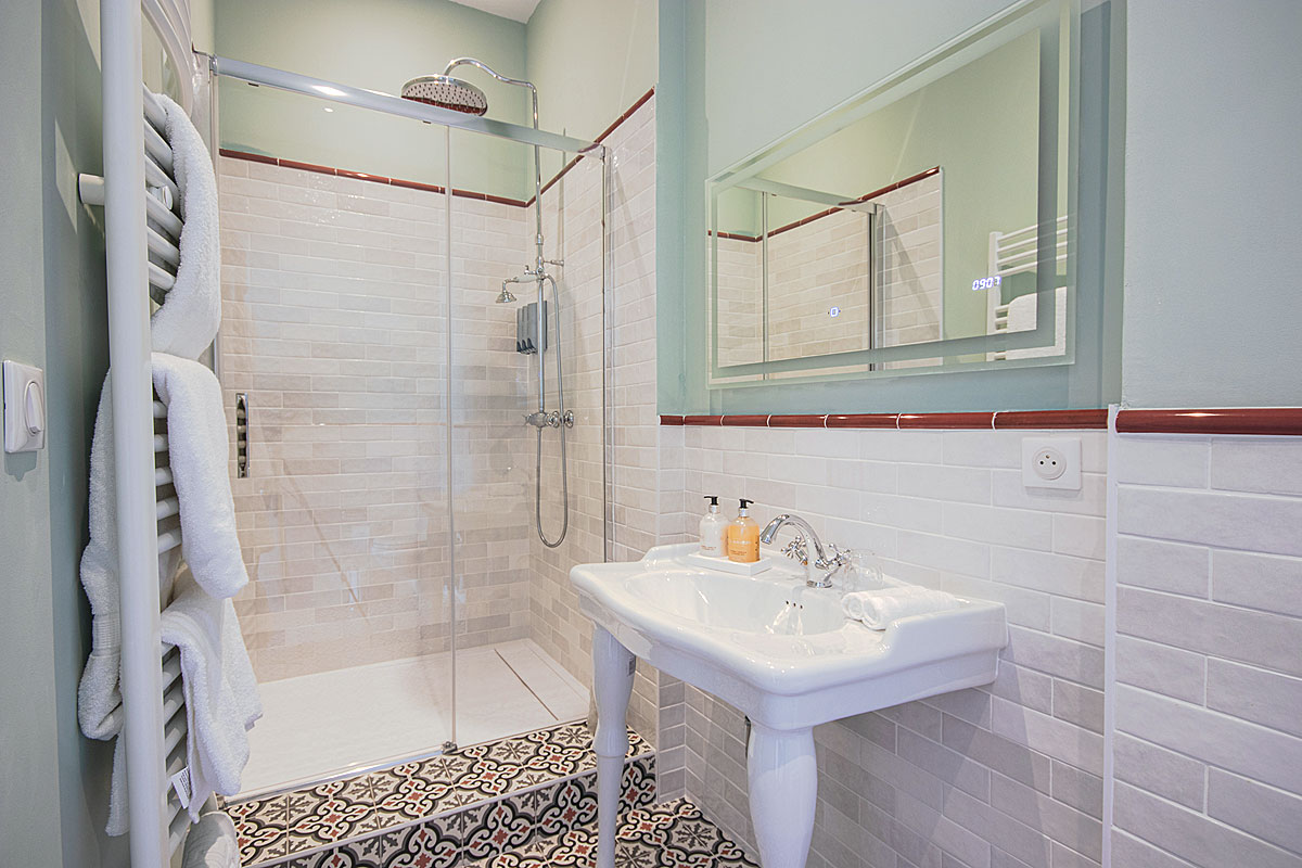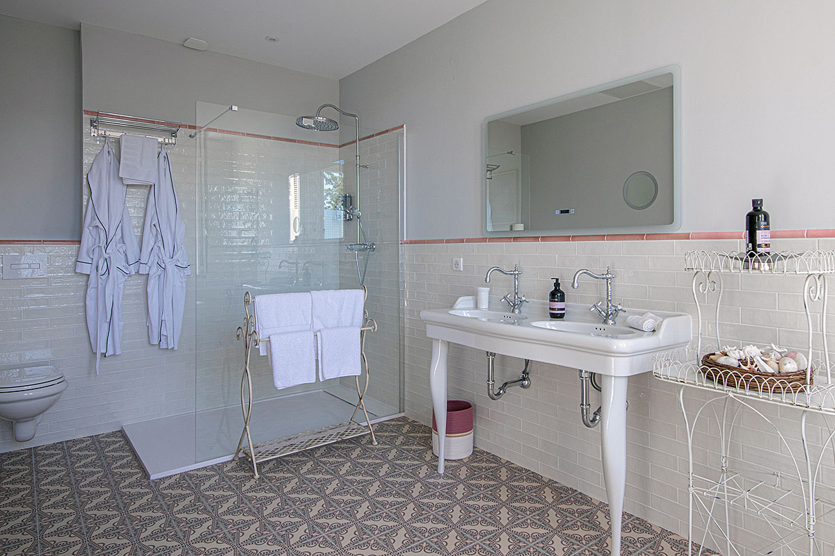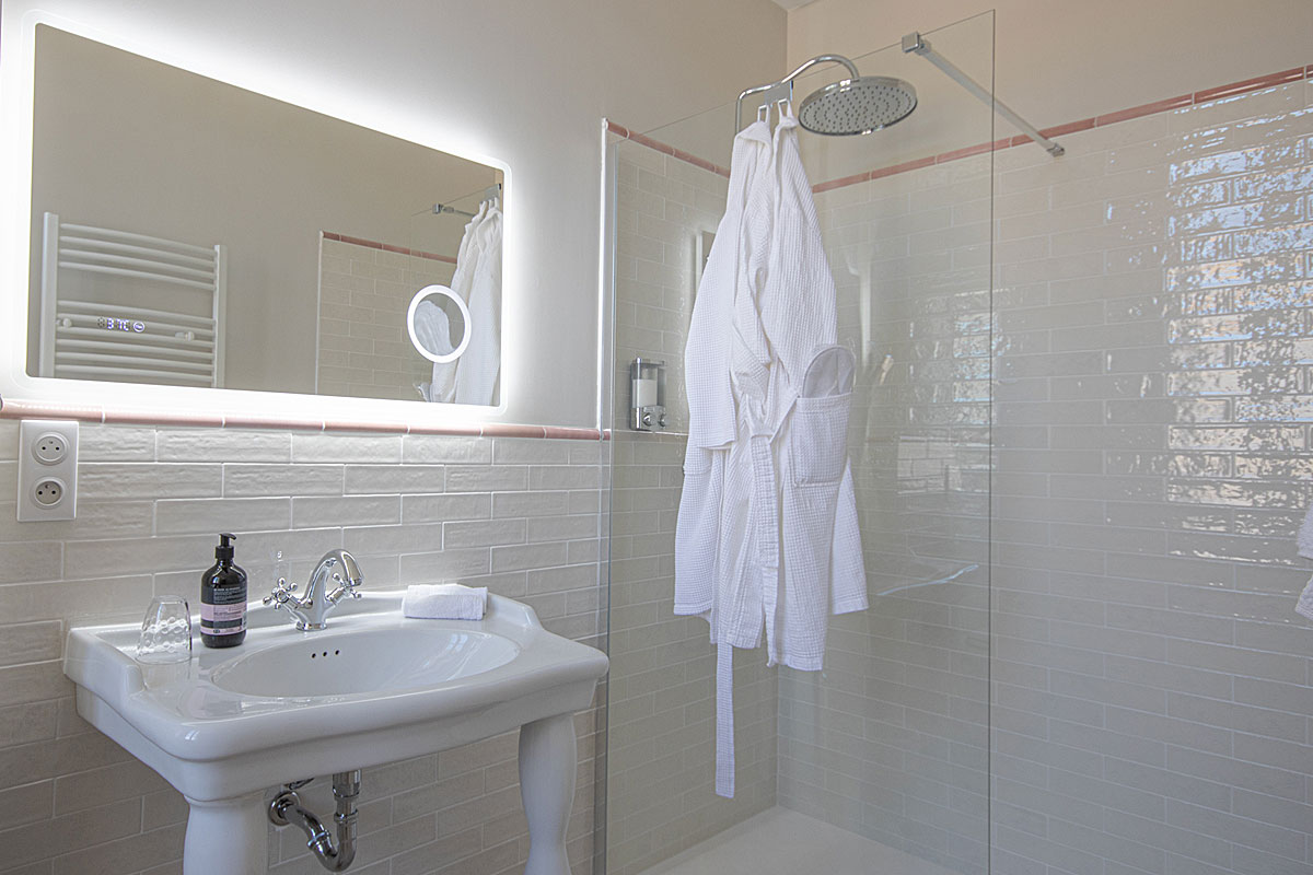 The Rose bedroom, air conditioned, super-king size bed (180cm), views over the garden. En suite shower room, modern walk-in rain shower, mirror with integrated magnifying glass and wc.