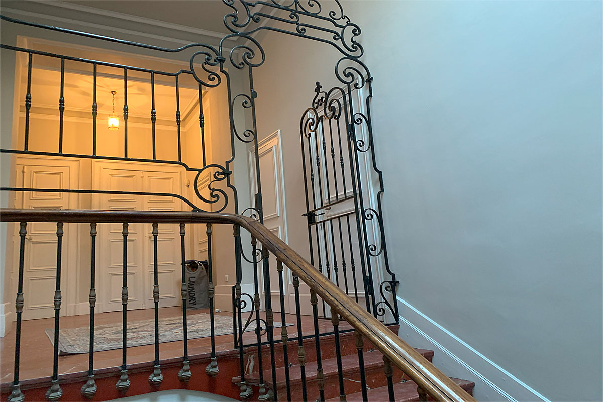 Another staircase leads from the hall up to the 2nd floor, the original iron gate dates back hundreds of years (the Chateau was taken over in the first world war and used as an information centre by the Germans).