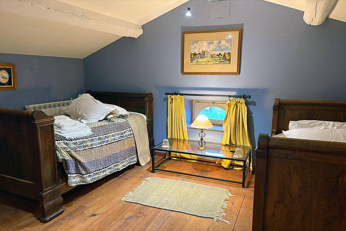The Lodge - Next to the main villa, has 2 bedrooms, one bathroom , kitchen and sitting area. The shepherd's hut is a unique place to sleep with 2 single beds. (The bathroom is in the lodge), there is also an outdoor shower!