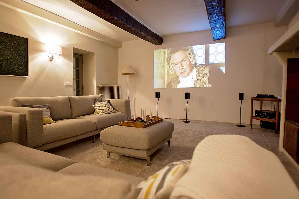 An antique door opens into to the renovated bastide where you will find a fully equipped kitchen with modern appliances and air-conditioning, a breakfast/dining room (seating 12-14) with access and view to the park and pool, sitting room with fireplace, cinema room with a selection of classic and current films and a large state-of-the-art cinema screen with full surround-sound and a downstairs cloakroom.