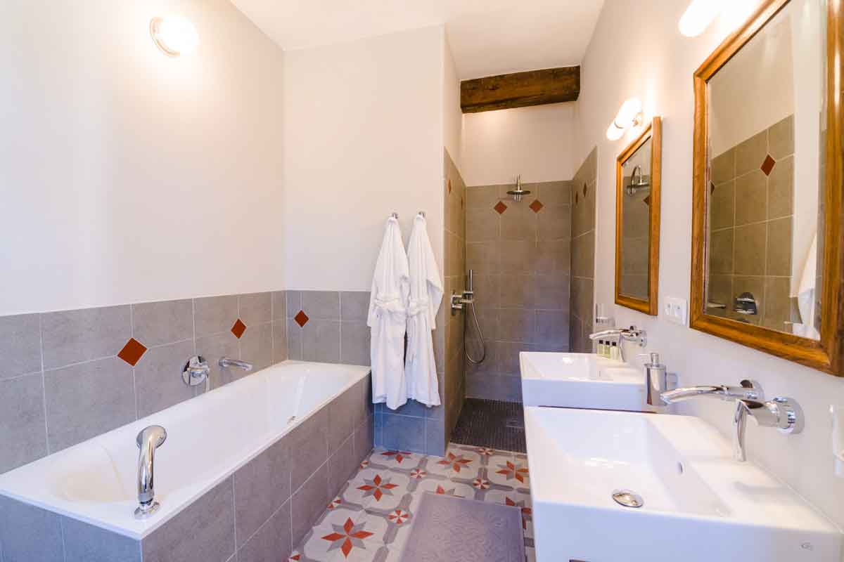 The upper level has 2 spacious air-conditioned bedrooms. The master bedroom is stylishly decorated in a contemporary-baroque style and has a large balcony overlooking the pool and park. Attached to the bedroom is a large en suite bathroom with free standing bath, rain shower, wc and hand basin. The spacious bedroom has a double bed, chaise longue, bureau and a lot of wardrobe space. The second bedroom room can be configured as 2 single or one king-sized bed with beautiful French art deco tiles and has a small en-suite bathroom with shower, wc and hand basin. Also from this level you have direct access to the Bastide.