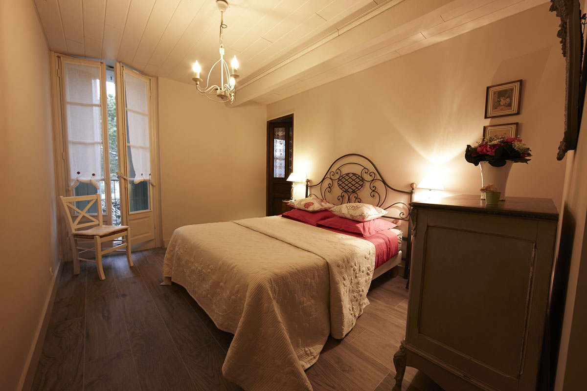 Bedroom 1 which has a new wooden floor, consists of a "Queensize" double bed (160cm x 200cm) and a chest of drawers. The original french windows open out onto the balcony. (Please close if you are using the air-conditioning).