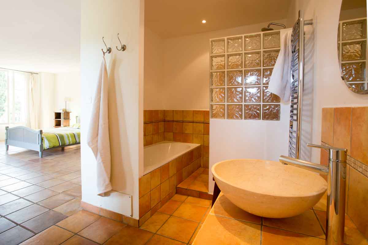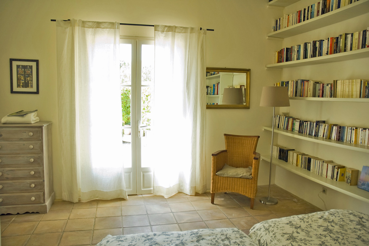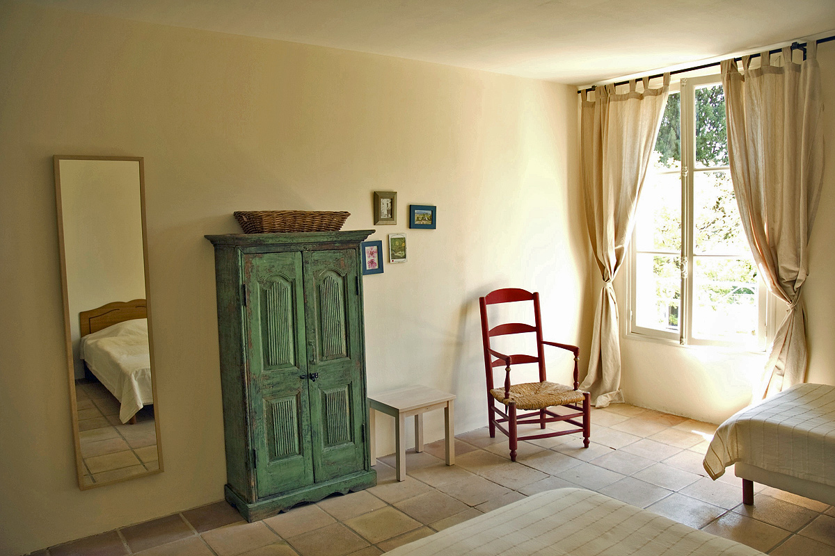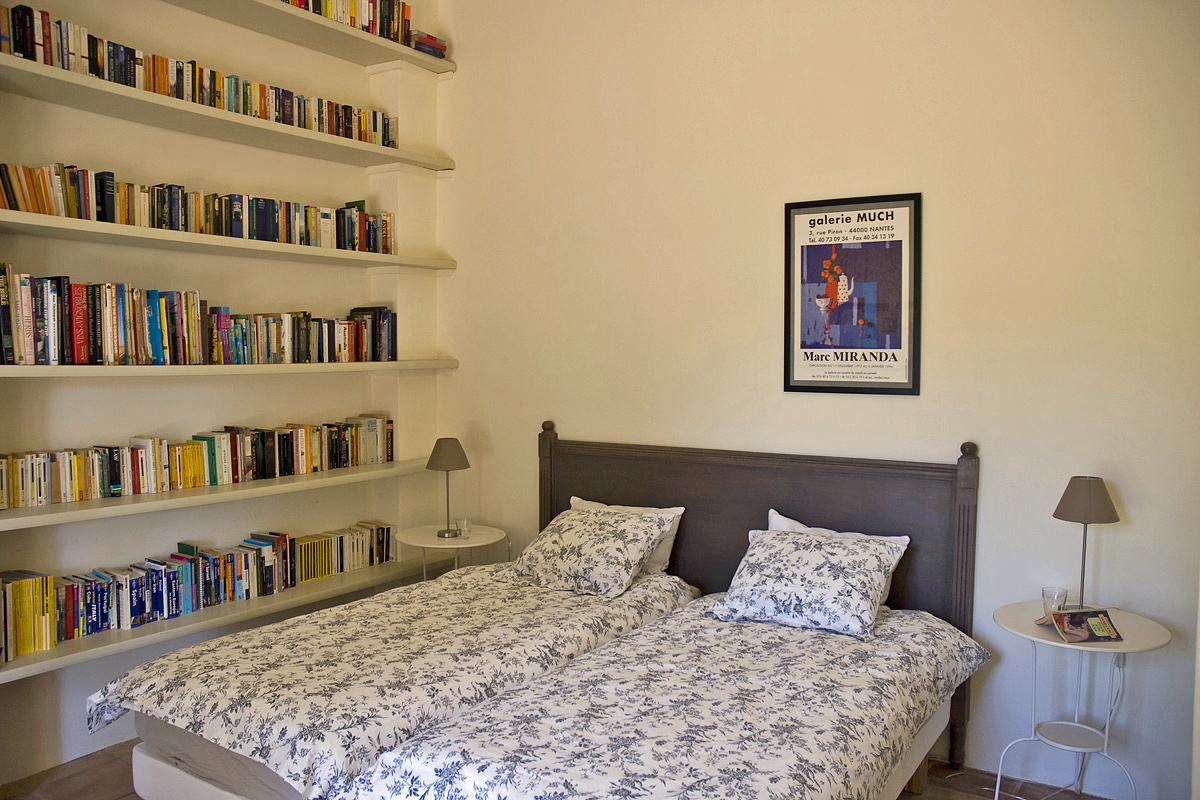 Ground floor bedroom - twin beds (90 x 200cm that can be made into a super king on request). (No air conditioining or heating). Ensuite bathroom with shower, wash basin and wc. French doors open out directly to the garden.