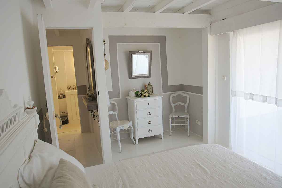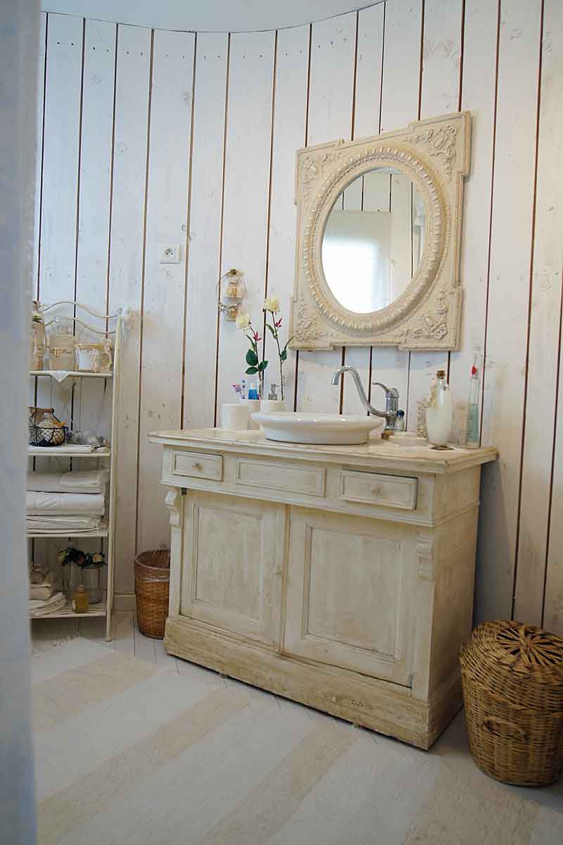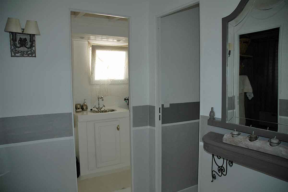 On this level there is an air-conditioned open plan living area beautifully decorated, with a high ceiling and all the wooden slatted interior is painted white featuring scalloped coving detail. The furniture is in the "distressed style" a painted sideboard and side tables, matching mirrors, dining table for 6, plus a sofa, two arm chairs and many treasured "objets". There is of course a TV offering French satellite channels, but the view is a better picture!