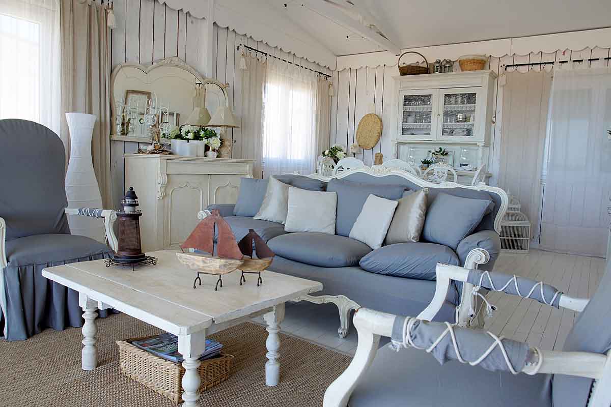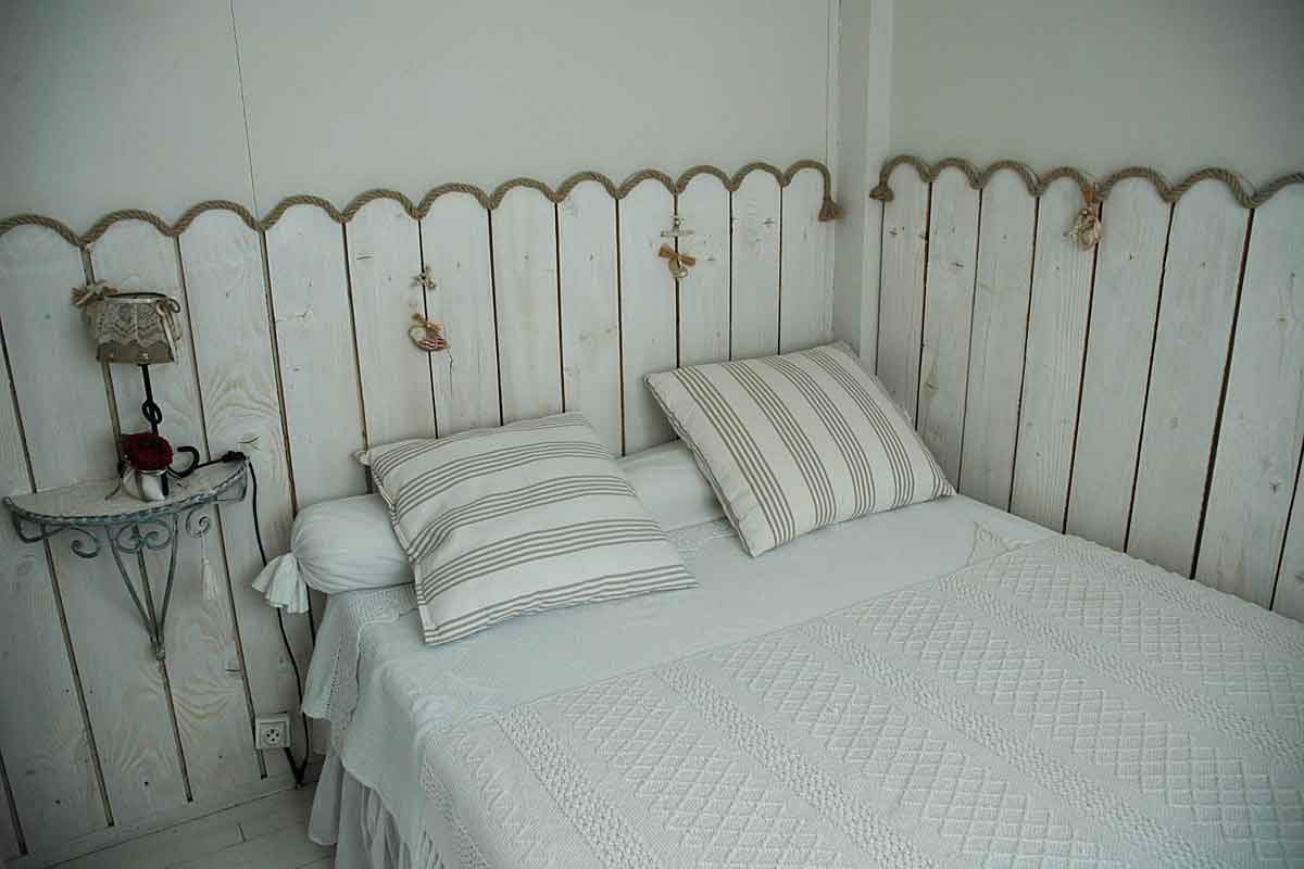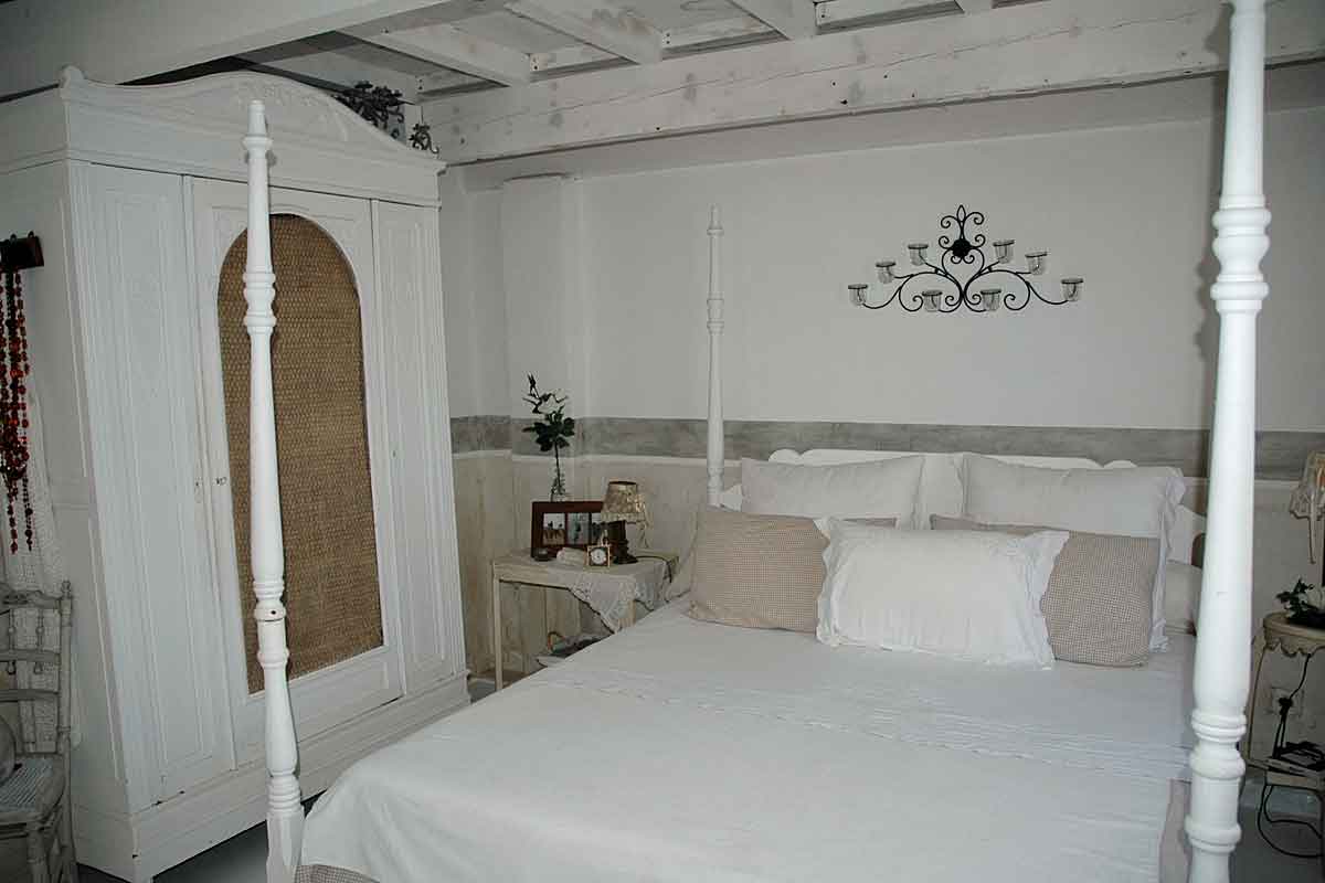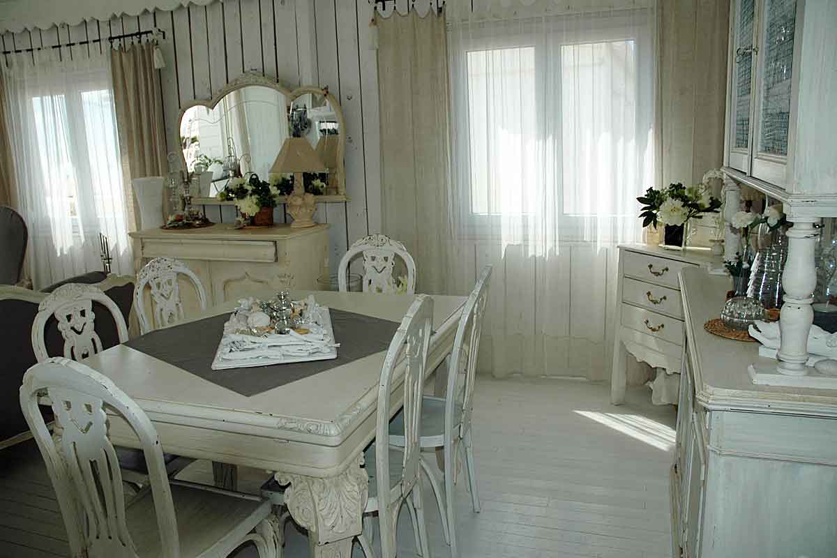 On this level there is an air-conditioned open plan living area beautifully decorated, with a high ceiling and all the wooden slatted interior is painted white featuring scalloped coving detail. The furniture is in the "distressed style" a painted sideboard and side tables, matching mirrors, dining table for 6, plus a sofa, two arm chairs and many treasured "objets". There is of course a TV offering French satellite channels, but the view is a better picture!