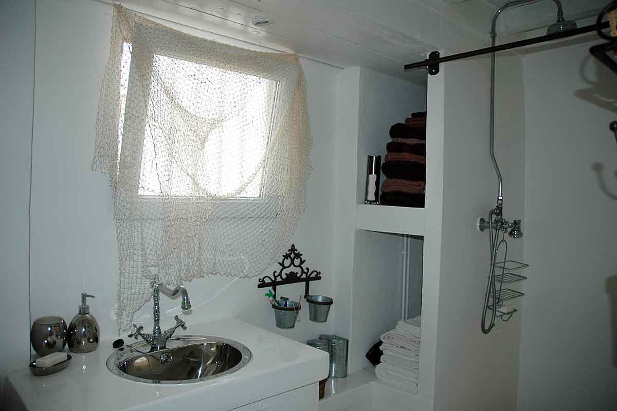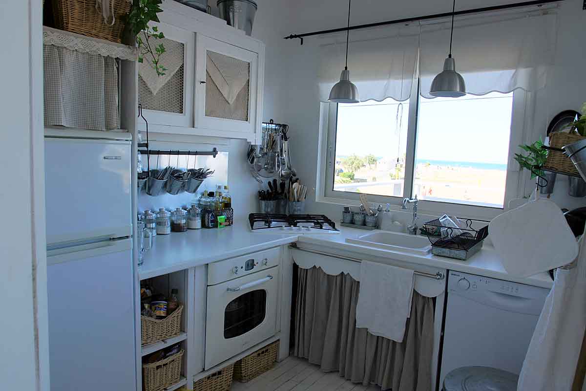The Kitchen is just off the living area and is well equipped for holiday use and is light filled by a window overlooking the beach and the terrace is easily accessible from here.