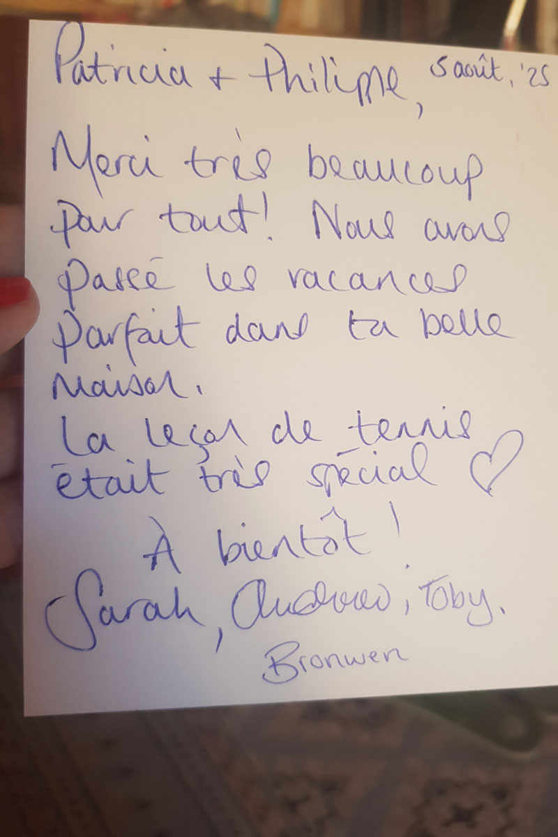 Thank you so much for everything – the great house, the pool, the tennis and the recommendations for places to visit. Our son has loved every minute and has spent every moment at the house playing sport of one sort or another or checking on the tortoises! The highlight of the holiday for him was his tennis lesson with the owner, a rare opportunity and an experience he thoroughly enjoyed – he is now signed up for tennis lessons in England. We have enjoyed our time here, good days out, great amenities, good wine and plenty of space and all with hosts who were charming and couldn’t do enough for us. Thank you so much for helping us enjoy a lovely holiday. South France Villas Client, August 2025.