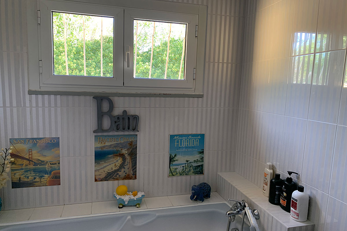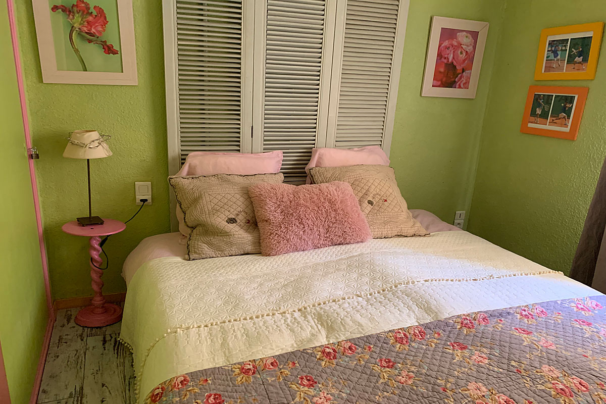 The Master bedroom (35m2) or 'family room' (with fan) has a 2 x 2 metre bed and a cot. There is a large en suite bathroom (15m2) with double wash hand basins, a bath with overhead shower and a wc. In the bathroom there is an exercise bike should you wish to keep up your fitness regime!