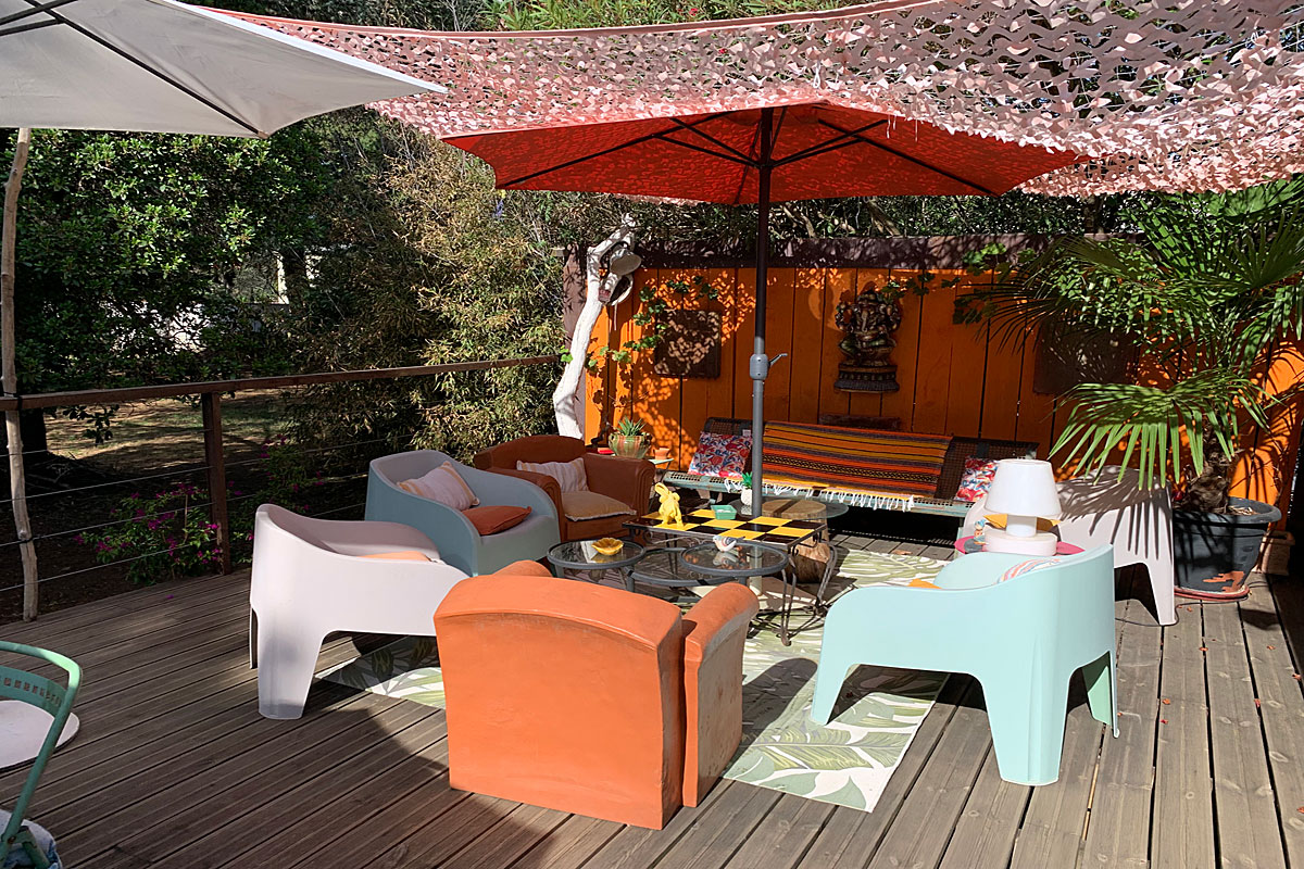 The exterior of this Pezenas villa is wonderful for outdoor living in the South of France - the large deck off the living area has both dining and relaxing areas.