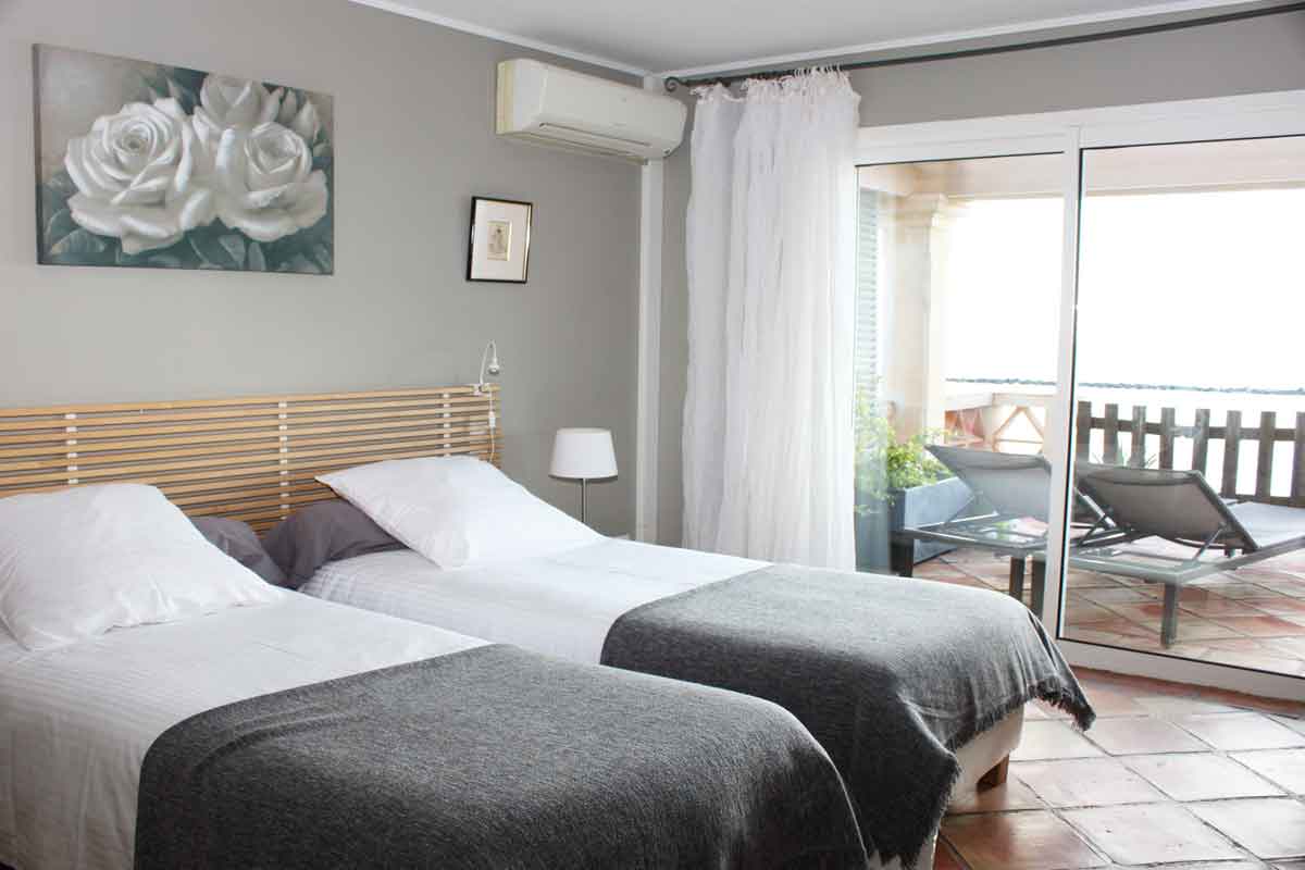 Off the lounge is Bedroom 1 with twin beds of 80cm, they can also be made into a large double, air conditioning and TV. Glass doors lead out onto the main terrace with amazing sea view. En suite shower room with wash hand basin and shower. Independent wc.