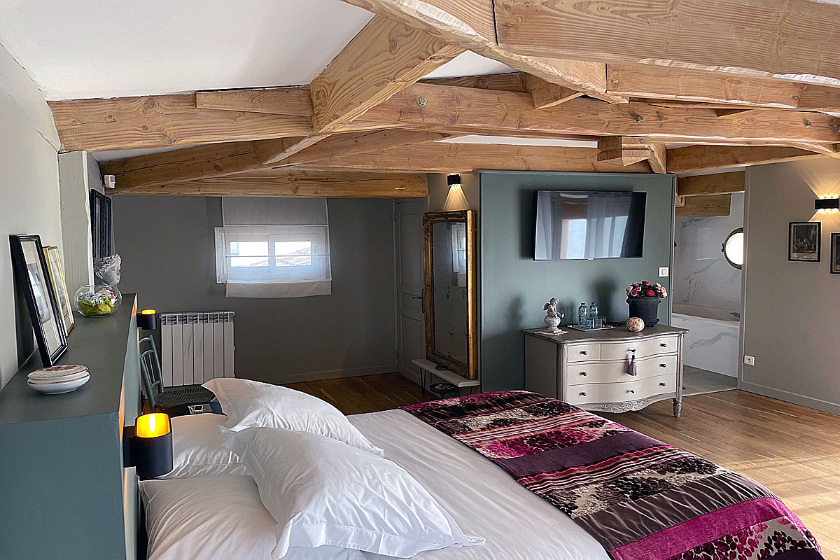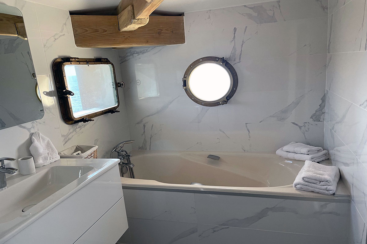 This bedroom has a slightly low ceiling on entrance, wooden floor and covered balcony (unsuitable for small children) overlooking the pool and the South of France coast. A glass door (mind your head!) leads onto another small terrace with a magnificent view of sea, beach and pool - perfect for watching the sun go down or waking up to a view, on a clear day, of the Pyrenees and Cap Creus in Spain hovering over the sea!