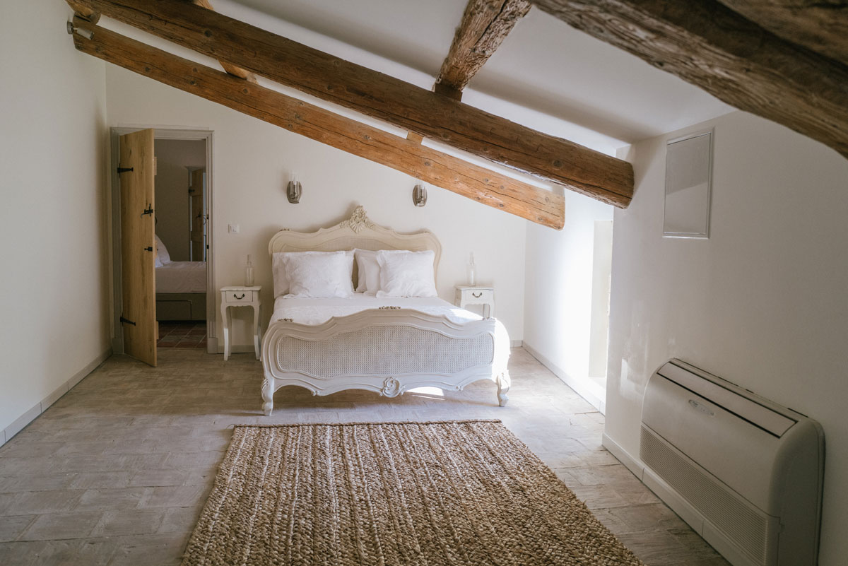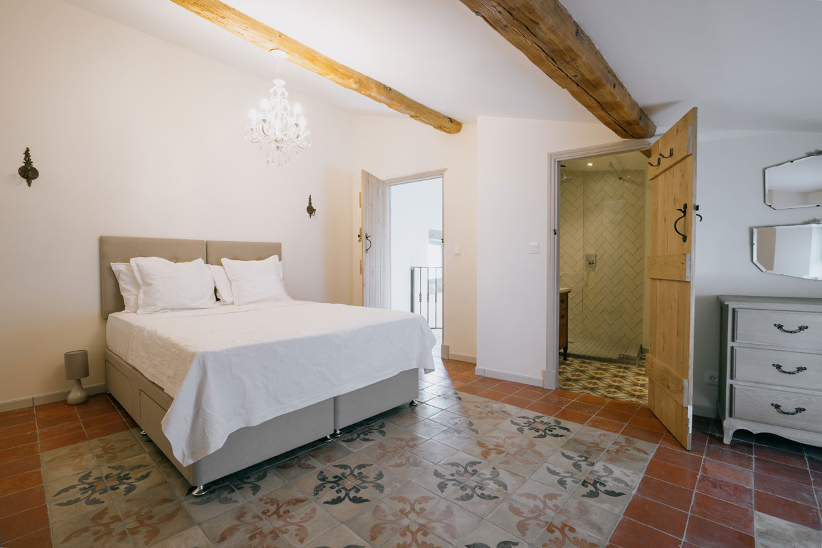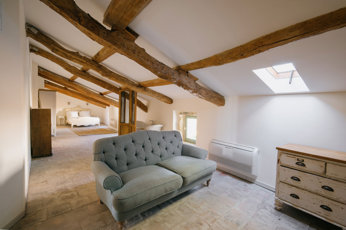 Master Suite (bedroom 4) Large open plan room with exposed beams (low in certain places), comfortable sofa, free standing bath, fixed double bed (150cm), air-conditioned.