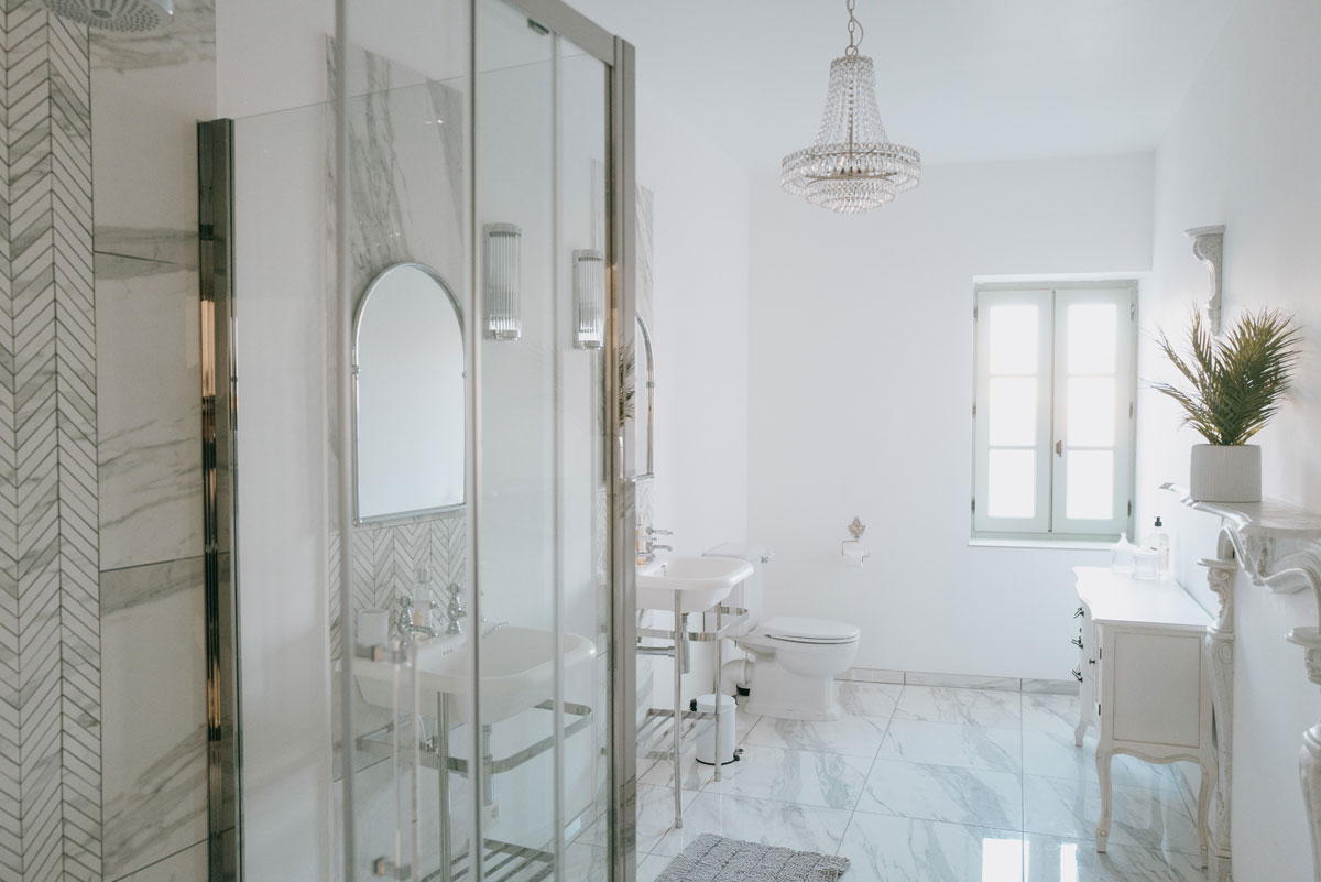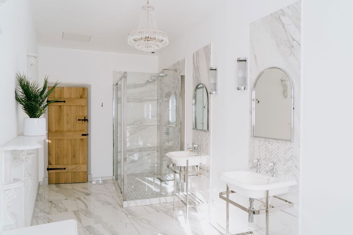 Very large separate marble bathroom across the landing with big twin shower, twin sinks and wc.