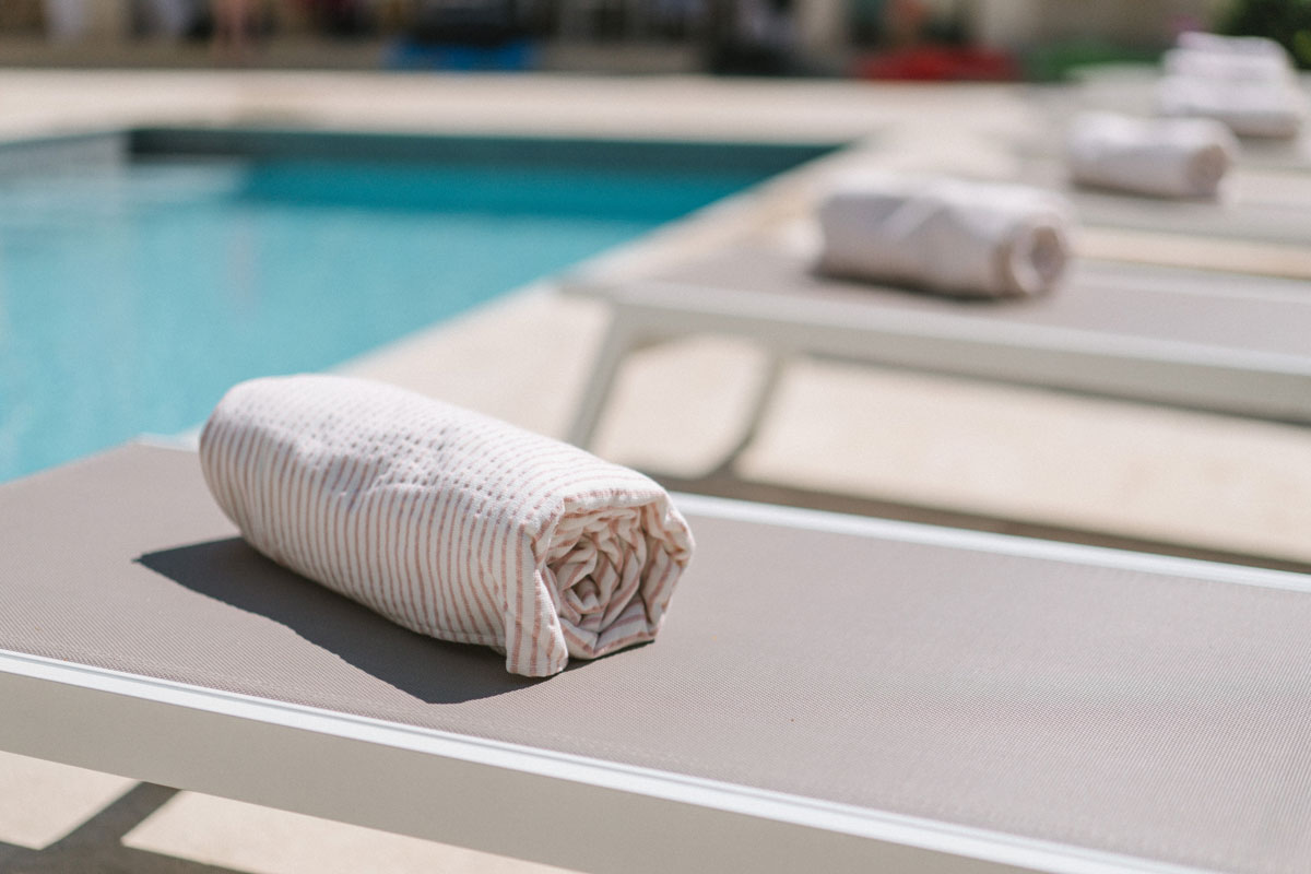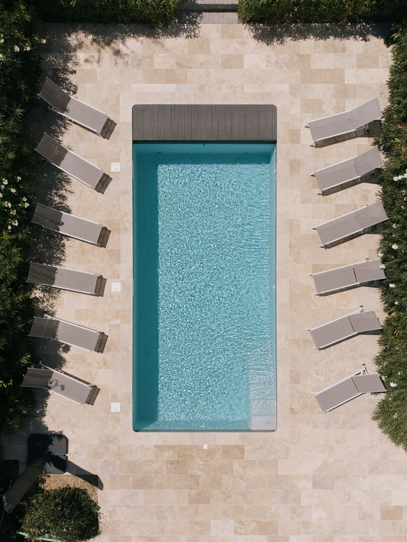 The 9 meter long heated pool is surrounded by a tiled terrace and can be secured with an electric cover.