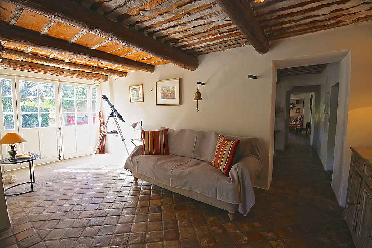 A large salon with lots of original features including beams, cosy sofas.