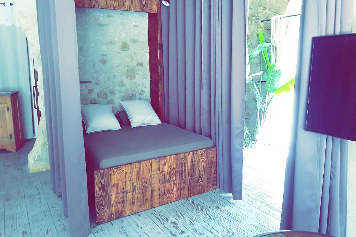 The sleeping area has huge, heavy curtains to section the area off and offer privacy. A double bed, hand crafted by a local trademen neatly folds against the wall when not in use. You could choose to leave the bedroom area curtained off all the time, and there would still be lots of space in the gite.