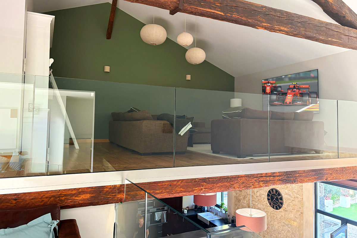 Staircase leads to the first floor, to the right on the mezzanine is the air-conditioned TV room (86 inch smart TV, with UK channels) which has a glass wall overlooking the ground floor.