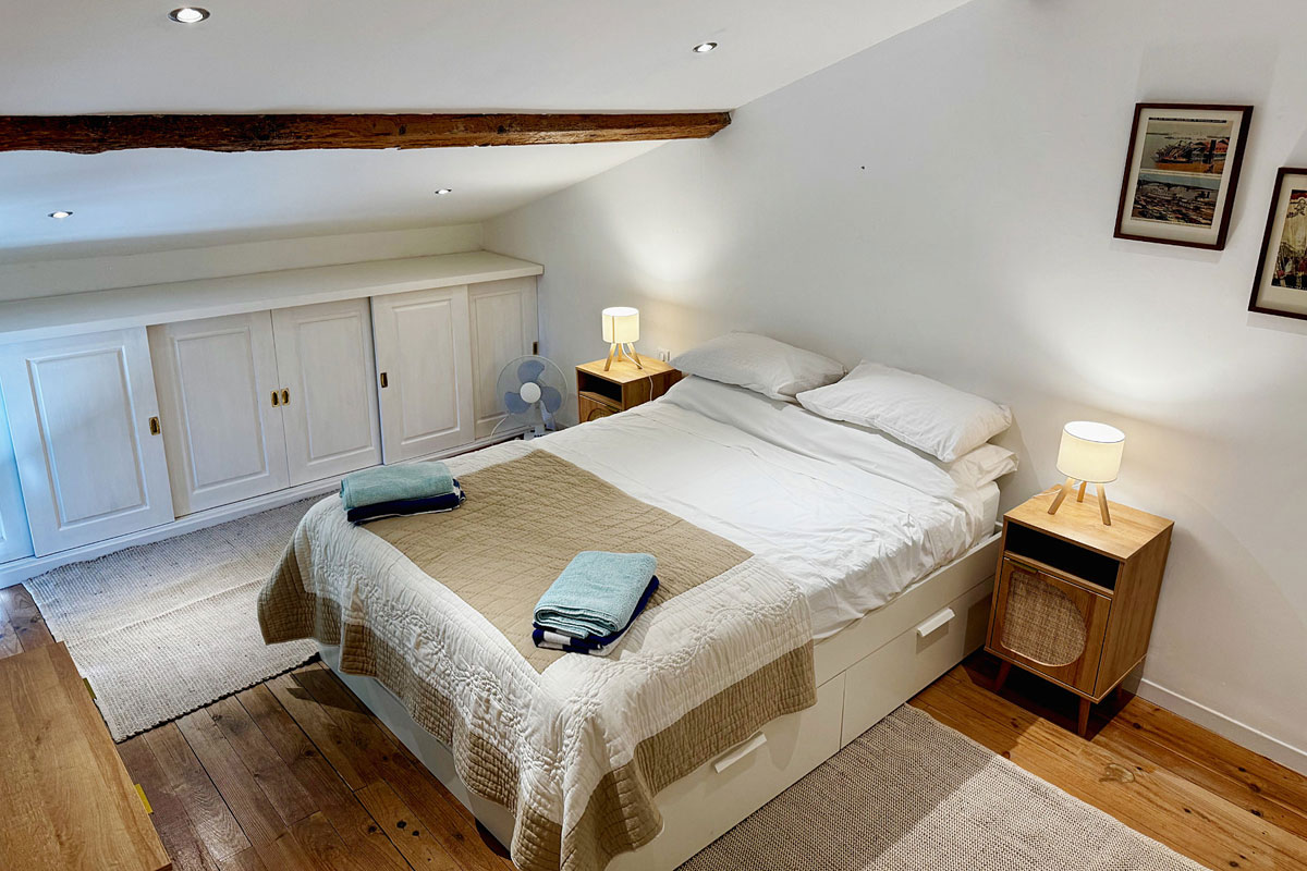Ground floor bedroom, King size double bed, air-conditioned, French doors lead out to the terrace and garden, en-suite shower room with wc and wash basin. (Possibility of adding an additional bed if twins required, ask for more details). Ideal for grandparents who would like a little more privacy.