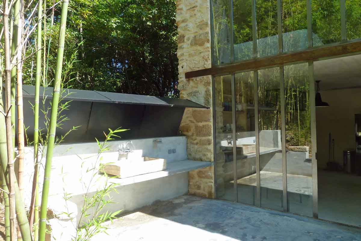 The immense terrace (apprx 150m2) overlooks the park with views to the Chateau and has a seating area with comfortable cushions, an area for outdoor dining and an outdoor kitchen with stone sink and plancha.