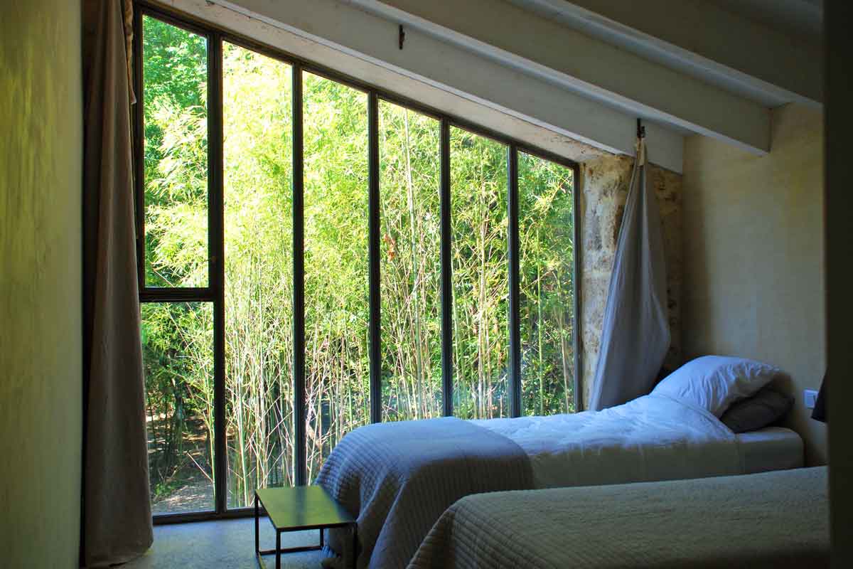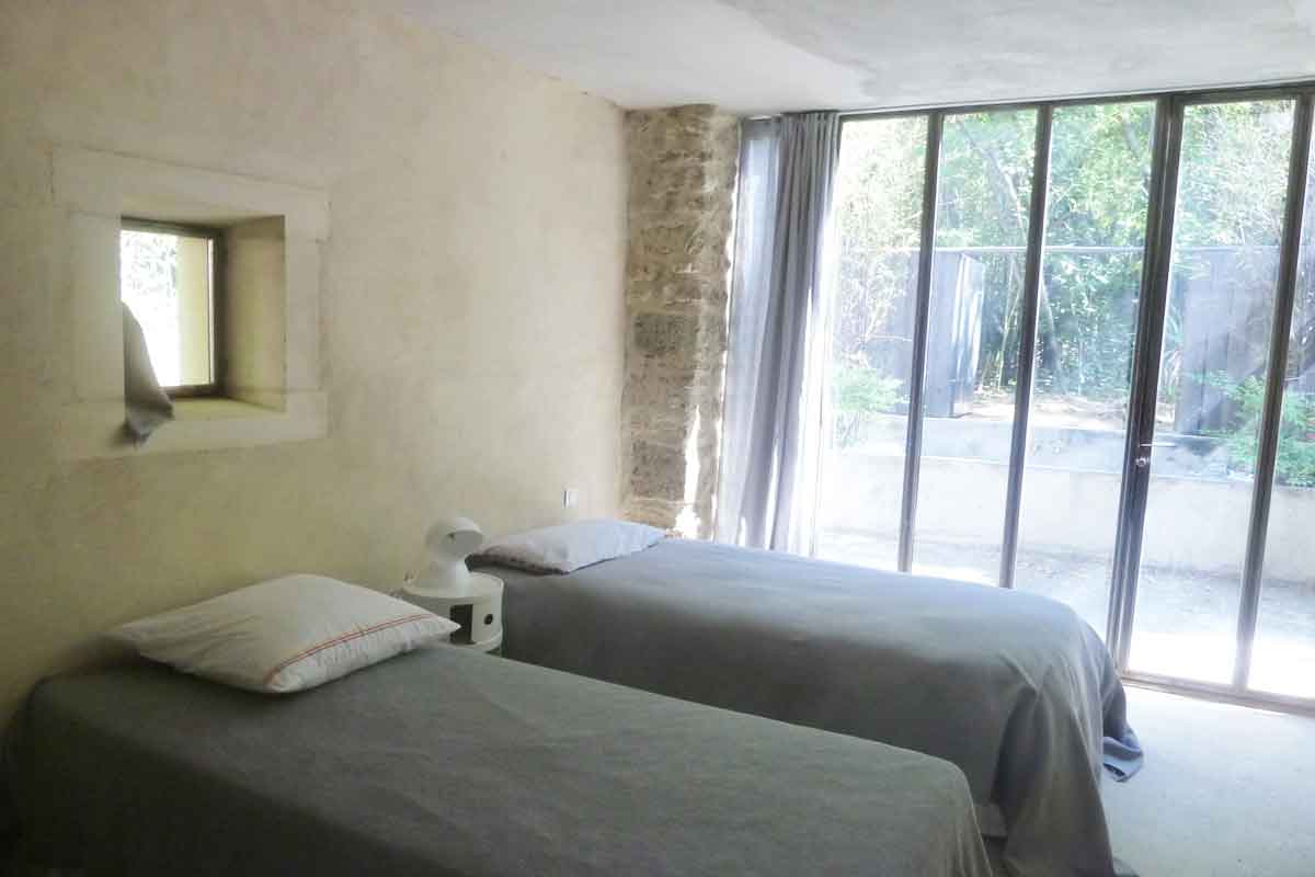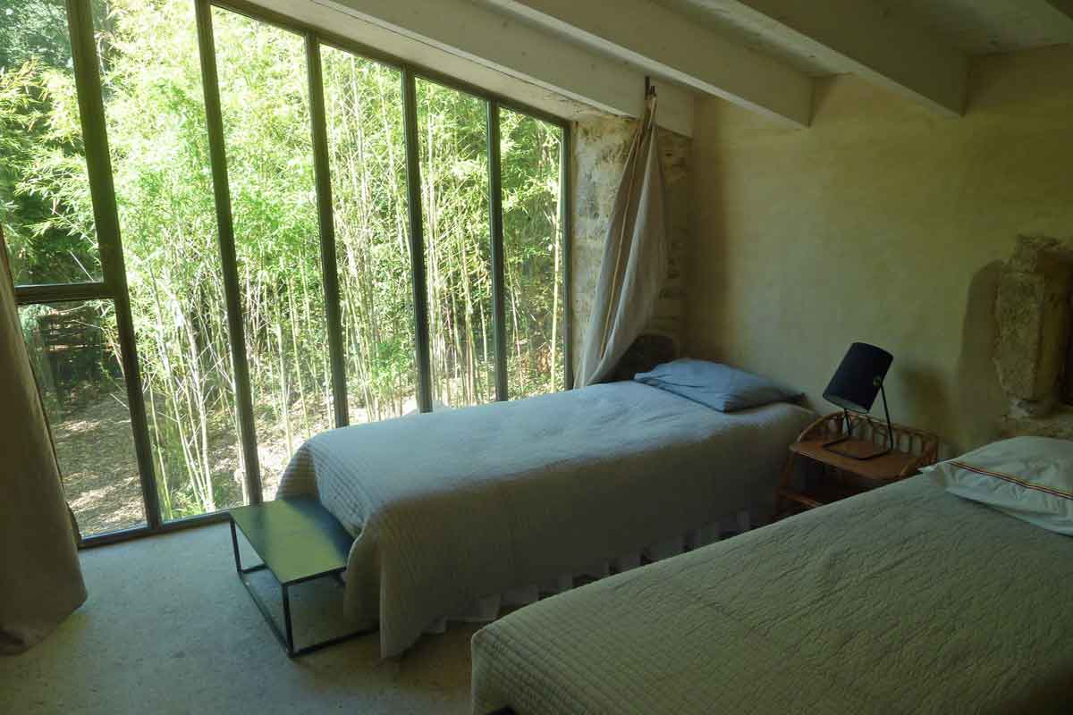 Twin room - 2 x 90cm beds (can be made into a Kingsize 180cm) with walk in shower and basin. Air Conditioned. Separate wc. A wall of glass with a French doors gives out to the exterior Balinese shower and stone bath and views to the Bamboo forest. Wheelchair accessible.