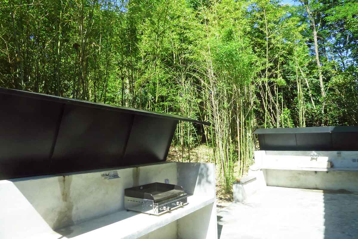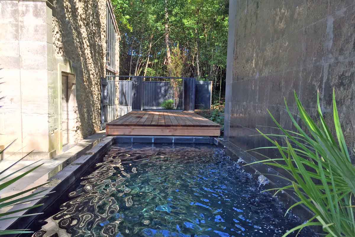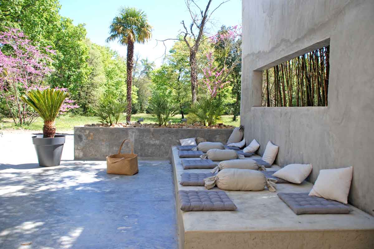 Clients renting the Orangerie have access to the main pool at HE097A Domaine Occitania and communal areas. The magnificent salt water infinity pool, 24m x 6m x 0.20cm-1.3m-1.8m, is shared by all 8 properties. At the shallow end a 'plage Californie' (depth 20cm) with 3 stone islands and Roman steps between each one lead down to the deeper section. The finish of black and basalt glass mosaic, complements the surrounding greenery and attracts the summer heat raising the pool temperature a couple of degrees higher than traditional blue tiles.