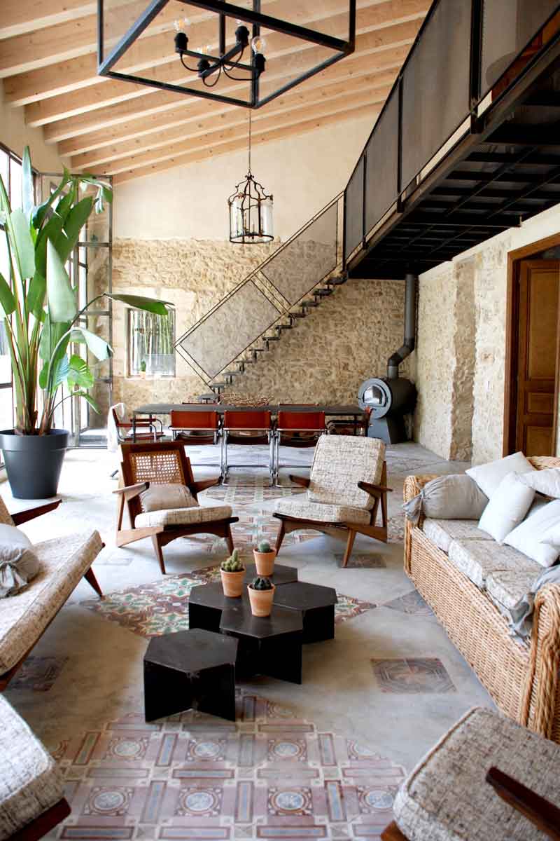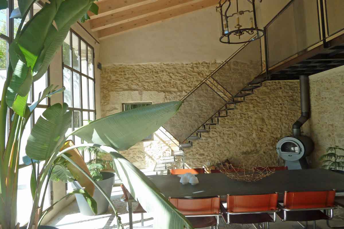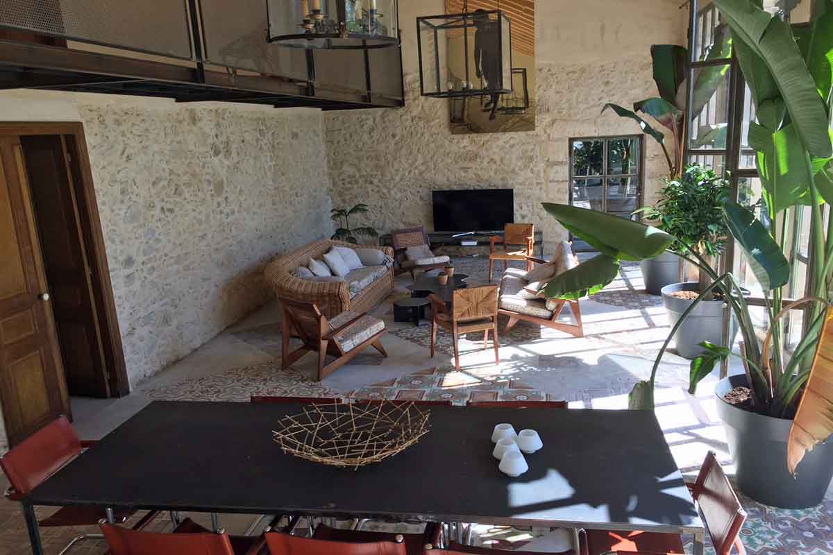 The living room is an amazing space - natural stone walls, beautiful original Languedoc floor tiles, huge hanging lighting, a cynlindrical wood burner and large plants in pots that thrive in this glass space. Floor to ceiling doors lead out on to a vast terrace, with the basalt heated plunge pool at one end and a large raised terrace at the other.