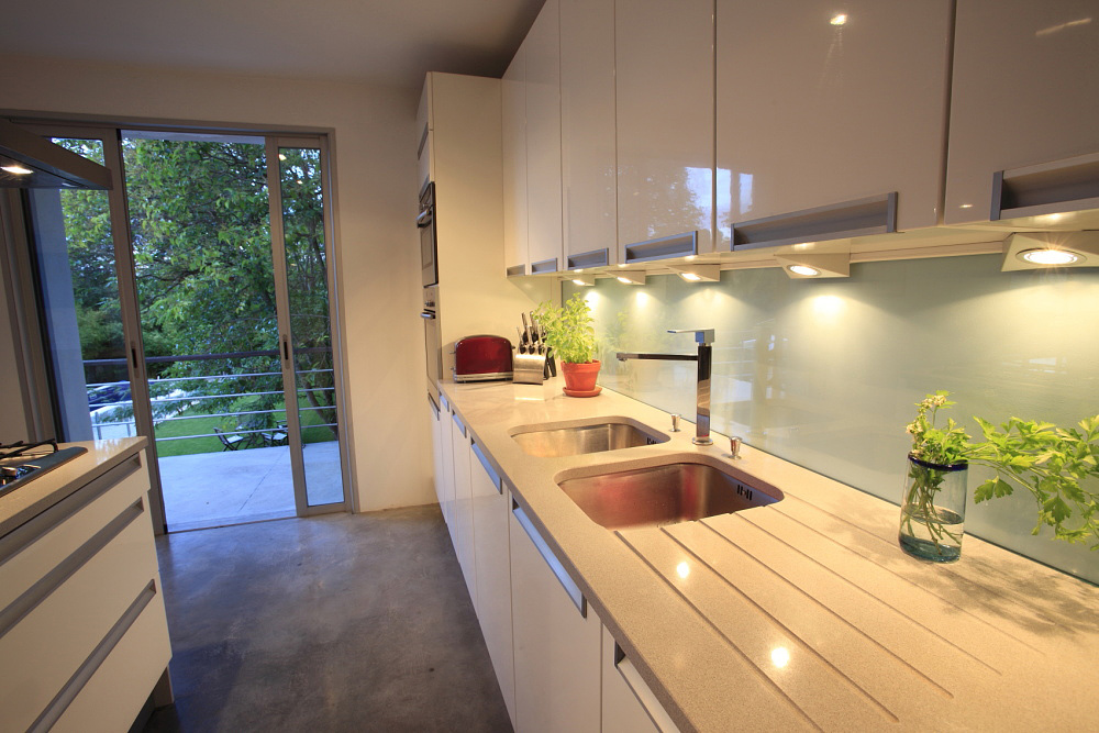 This two storey luminous modernist house boasts masses of space and has a designer feel, making the most of the light and views the living area and kitchen are on the first floor and 3 of the 4 bedrooms on the ground floor.