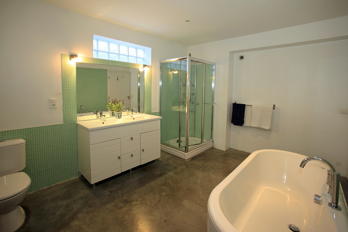 The other two large downstairs bedrooms (one kingsize and one twin) both with air conditioning, fited wardrobes, share a large bathroom with separate bath, shower, wc, double wash basin, washing machine, tumble dryer and Italian glass mosaic tiles.