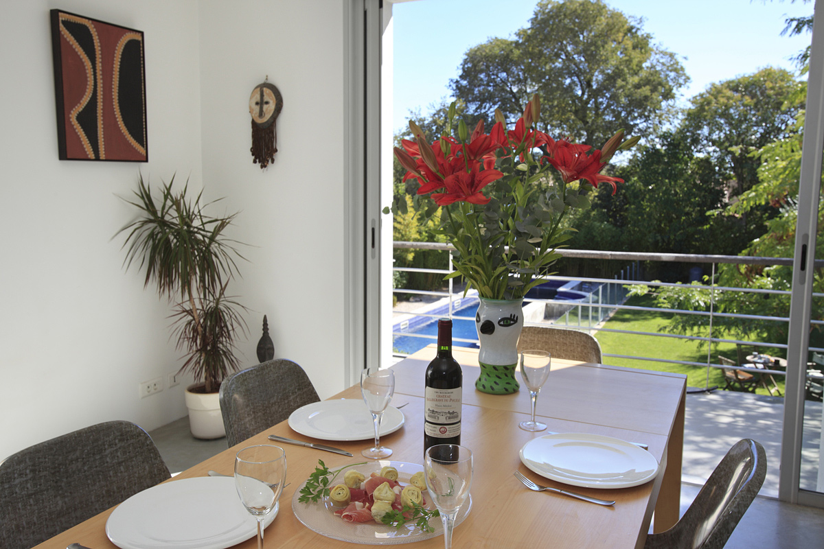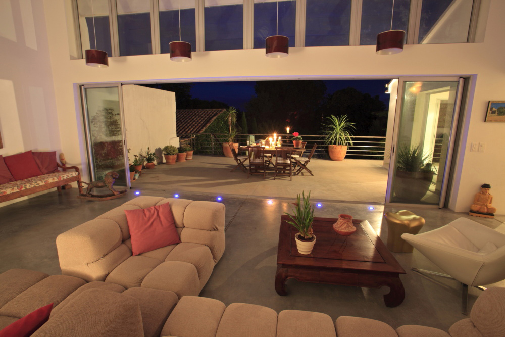 Contemporary dining room seating 8 with inside/outside seamless lifestyle. This goes out directly onto the terrace overlooking the pool. 19 steps lead down into the garden and the pool area.