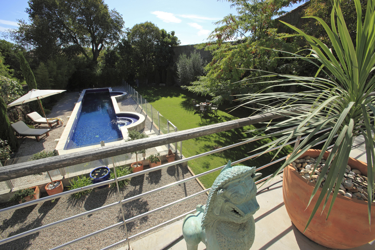 The landscaped area surrounding the pool is planted with Mediterranean shrubs and trees including cypresses, roses, agapanthas and bamboo framing with an ancient statue of St Roch bordered in its alcove by ancient stone walls.
