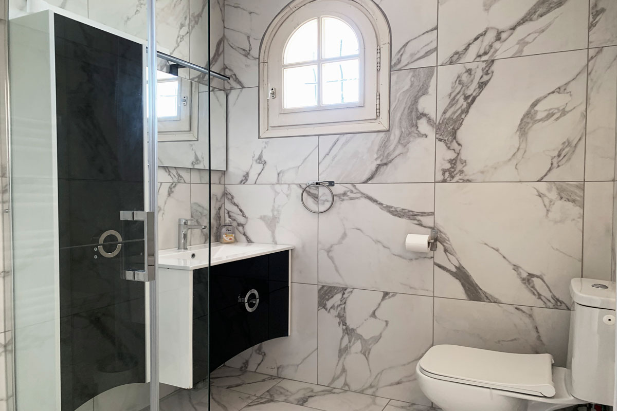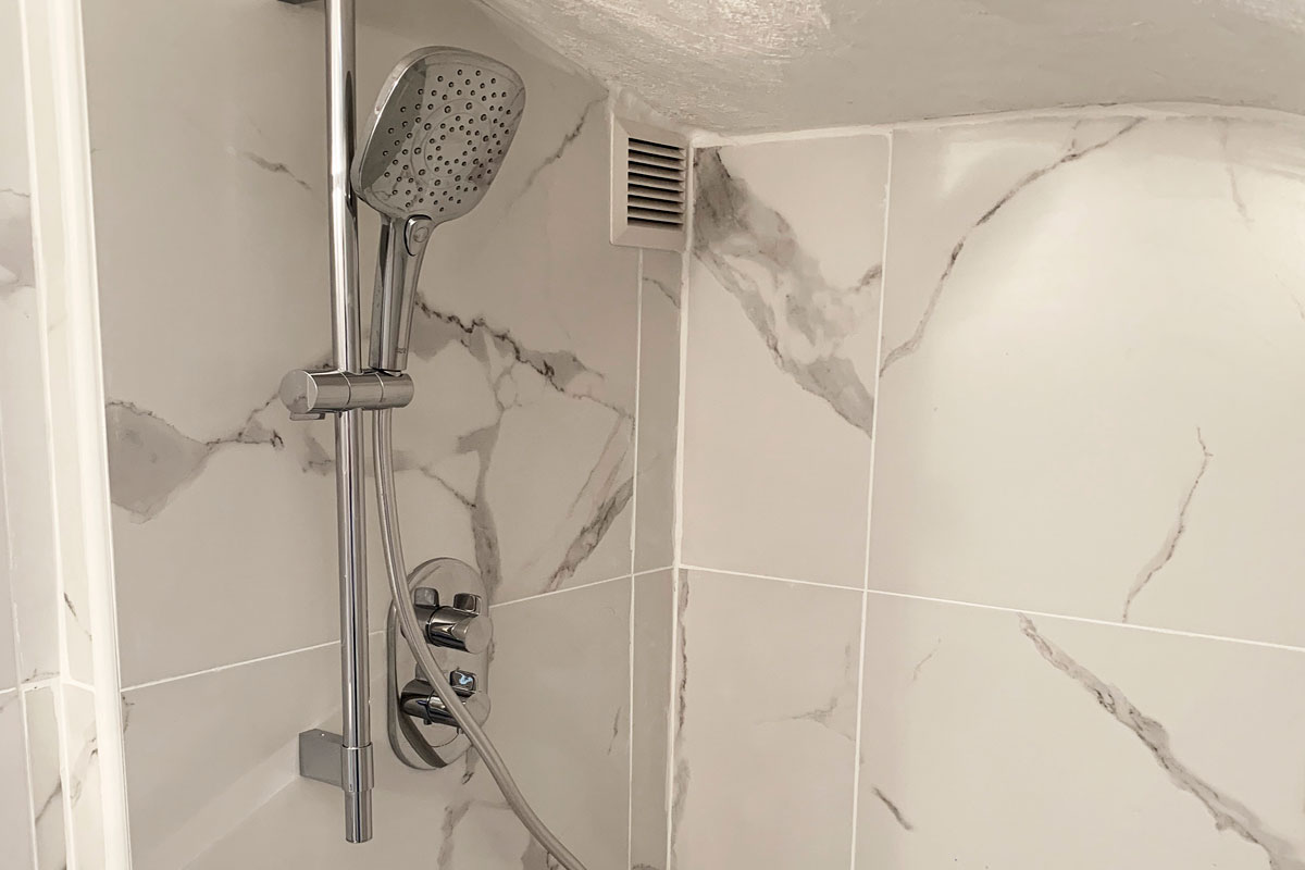 Recently renovated in a grey and white style, there is a bath with overhead rain shower, sink and wc.