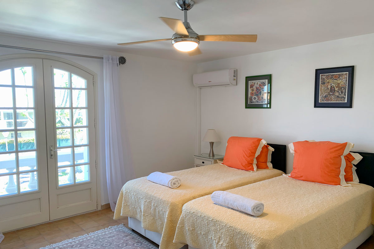 Air-conditioned twin bedroom, with doors opening out to the terrace.