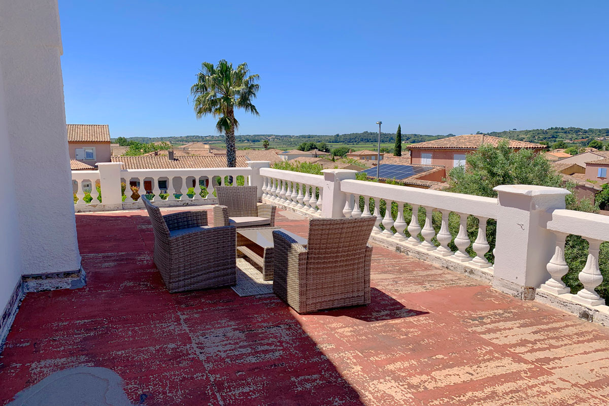 Pezenas, South of France, holiday villa with air-conditioning, pool can be heated, walking distance to the town and its restaurants, artisan shops and supermarkets. Fabulous views form the first floor sun terrace.
