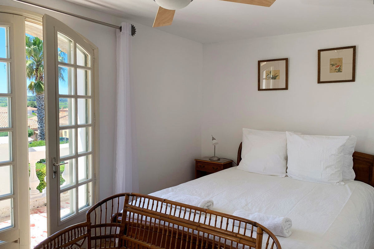 Air-conditioned double bedroom with en suite shower room and wc. Doors lead out onto the large terrace which overlooks the pool and beyond.