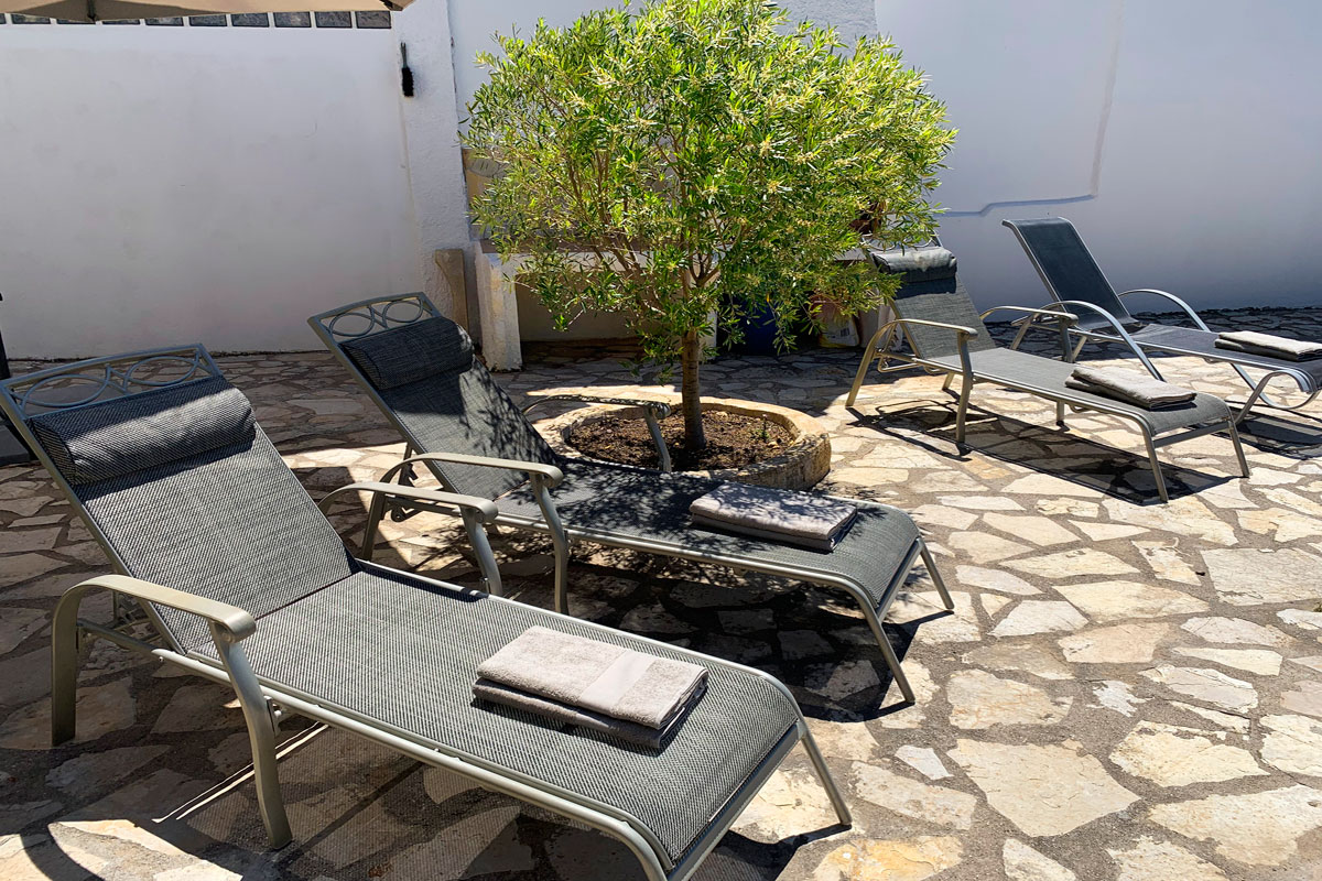 The terraces around the pool have comfortable sun loungers, there is a dining table under the covered terrace.