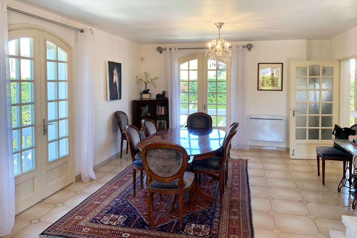 The main entrance is from the secure front courtyard, to the right is the air-conditioned lounge and dining room, with some lovely contemporary art work on display. French doors lead out to the pool and terraces.
